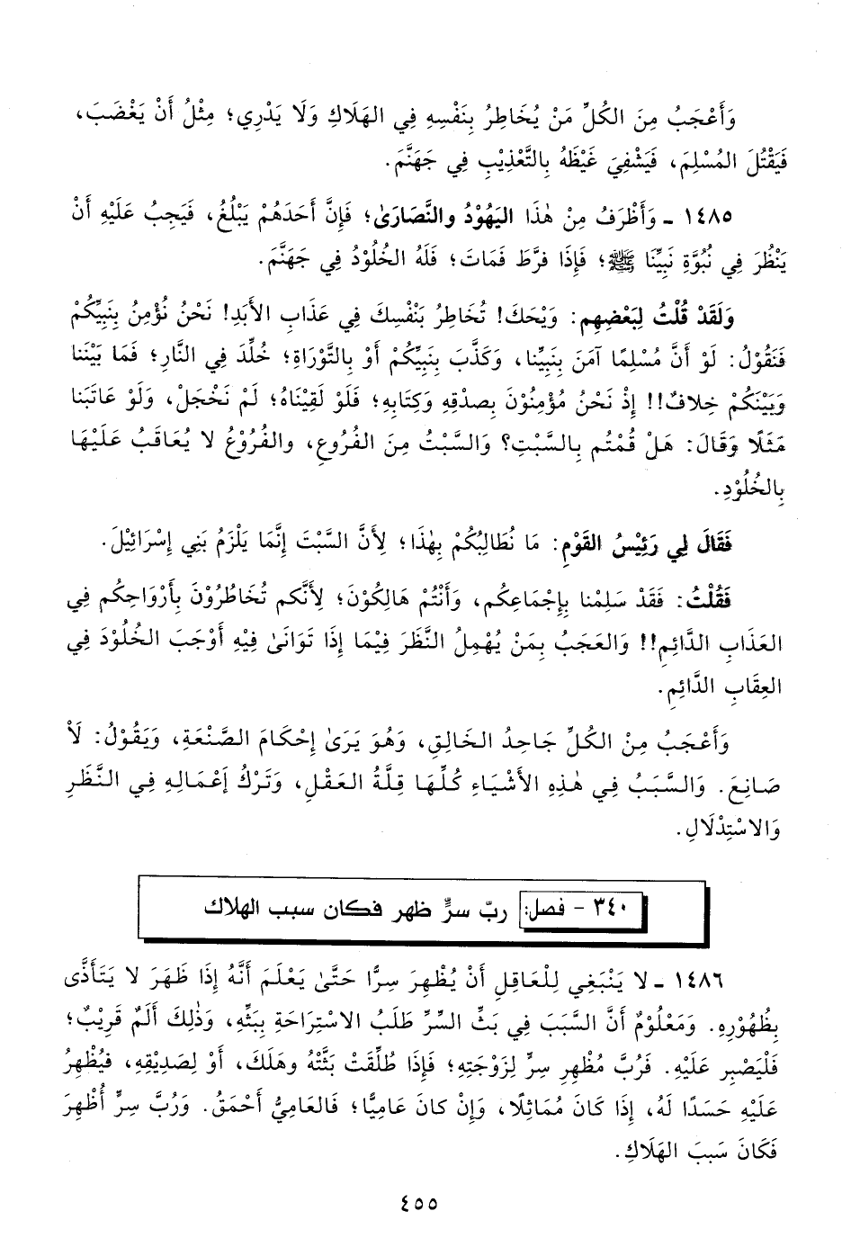 1485- وأظرف من هذا اليهود والنصارى، فإن أحدهم يبلغ، فيجب عليه أن ينظر في نبوة نبينا صلى الله عليه وسلم؛ فإذا فرط فمات، فله الخلود في جهنم.