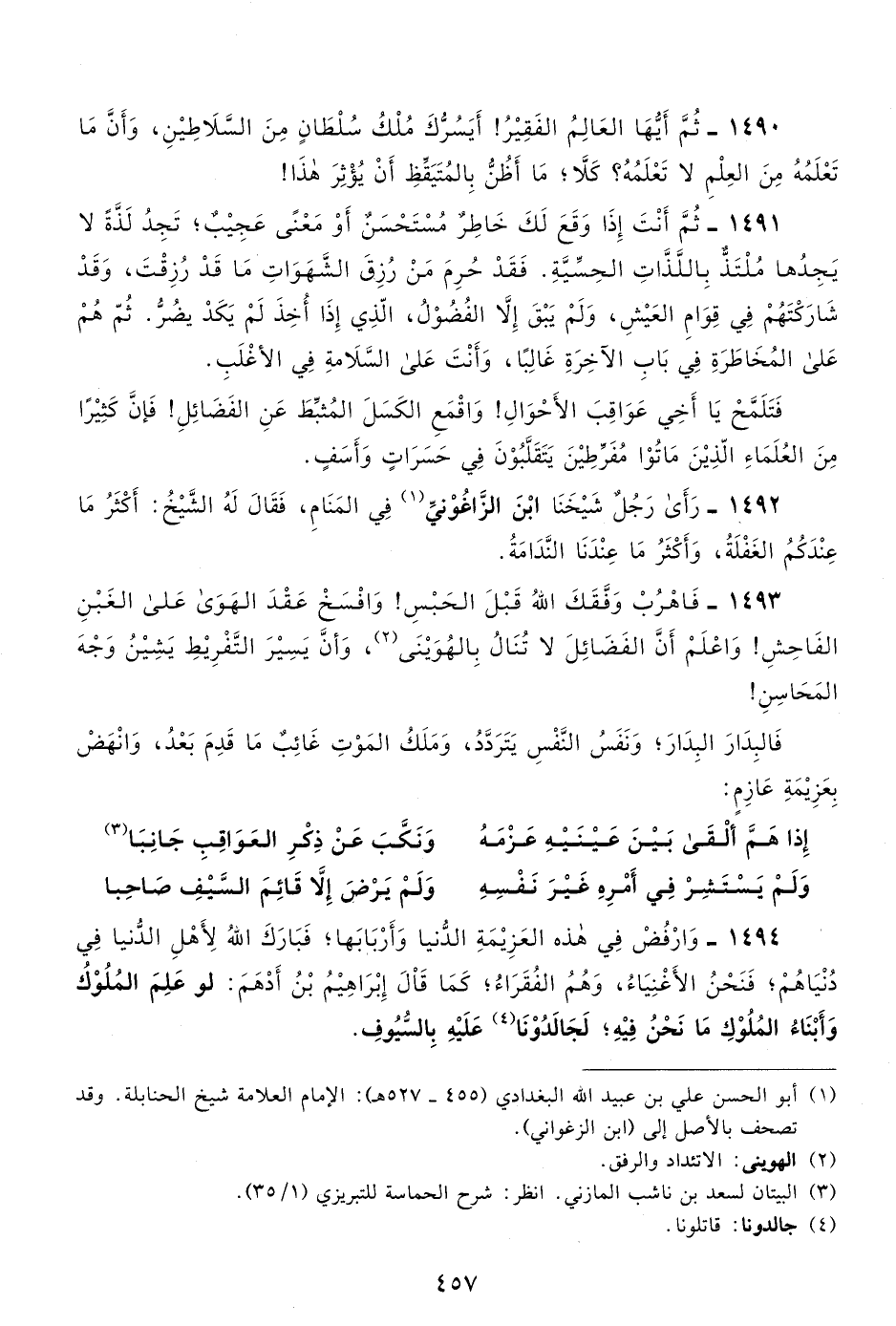 1490- ثم أيها العالم الفقير! أيسرك ملك سلطان من السلاطين، وأن ما تعلمه من العلم لا تعلمه؟ كلا، ما أظن بالمتيقظ أن يؤثر هذا!