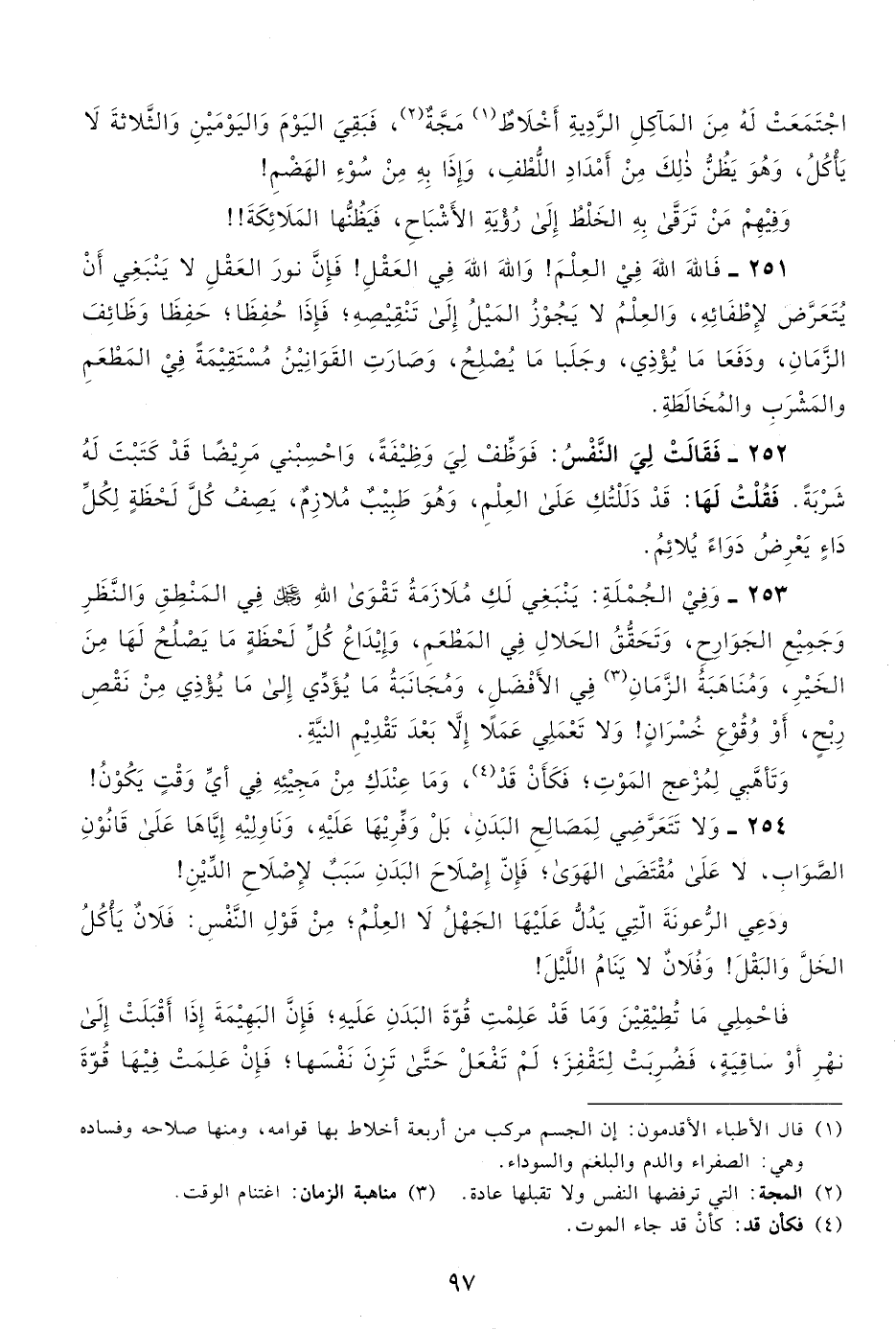 252- فقالت لي النفس: فوظف لي وظيفة، واحسبني مريضًا قد كتبت له شربة. فقلت لها: قد دللتك على العلم، وهو طبيب ملازم، يصف كل لحظة لكل داء يعرض دواء يلائم.