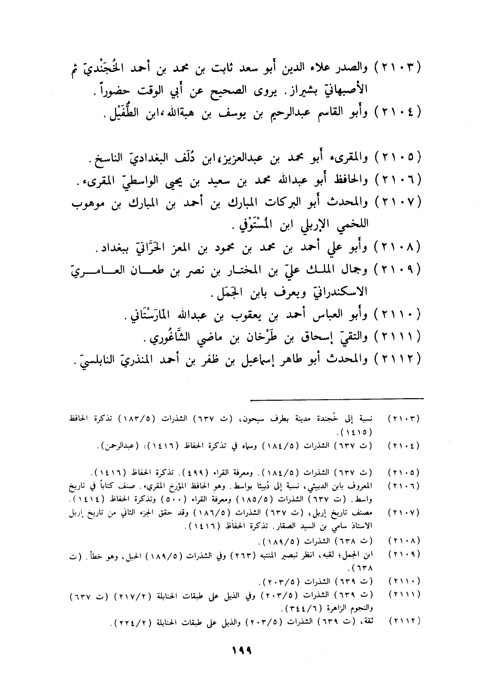 2103 - والصدر عَلَاء الدّين أَبُو سعد ثَابت بن مُحَمَّد بن احْمَد الخجندي ثمَّ الْأَصْبَهَانِيّ بشيراز يروي الصَّحِيح عَن أبي الْوَقْت حضورا