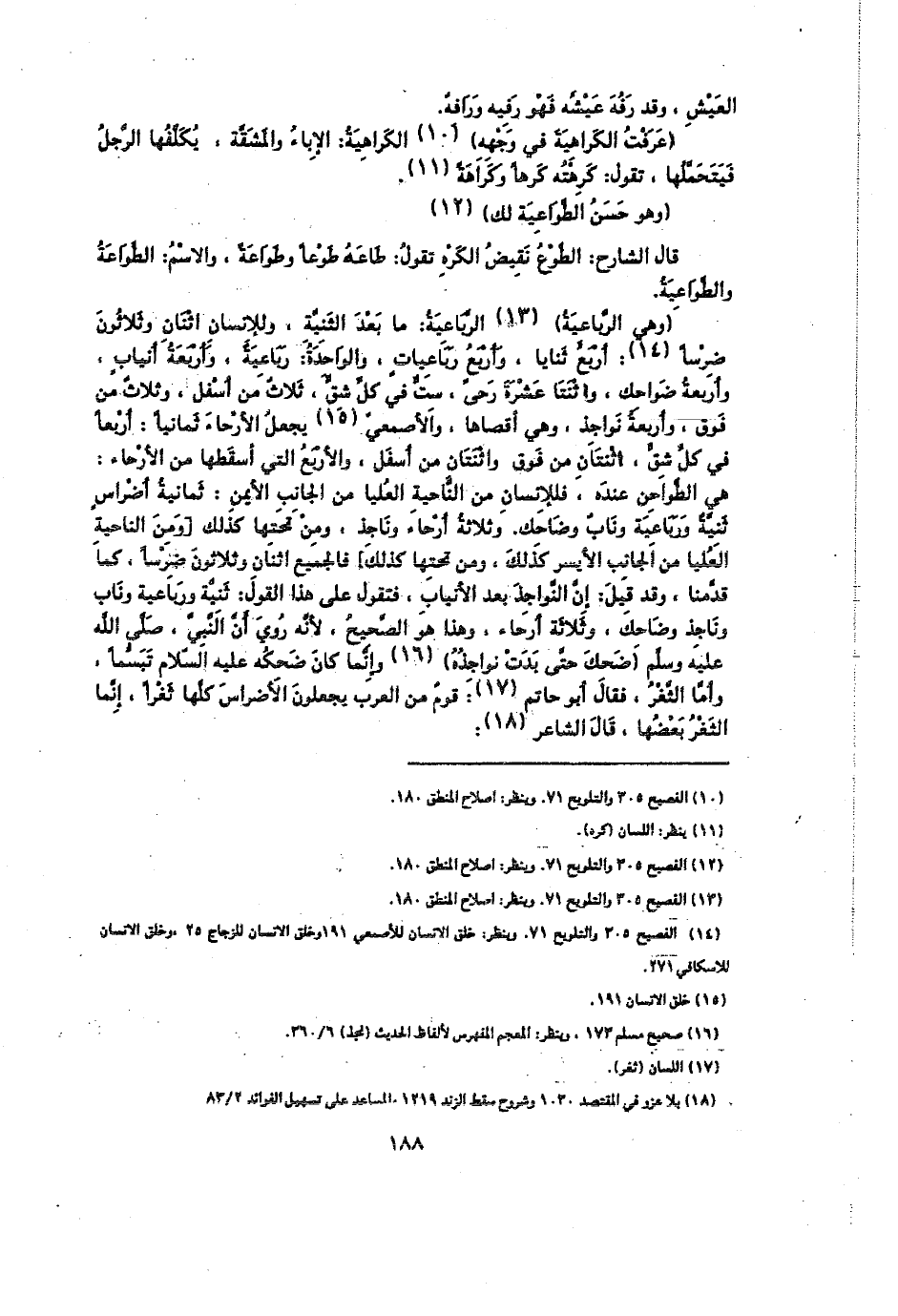 (وهي الرباعية) الرباعية: ما بعد الثنية، وللإنسان اثنان وثلاثون ضرسًا: أربع ثنايا، وأربع رباعيات، والواحدة: رباعية، وأربعة أنياب، وأربعة ضواحك، واثنتا عشرة رحى، ست في كل شق، ثلاث من أسفل، وثلاث من فوق، وأربعة نواجذ، وهي أقصاها، والأصمعي يجعل الأرحاء ثمانيًا: أربعًا في كل شق، اثنتان من فوق، واثنتان من أسفل، والأربع التي أسقطها من الأرحاء: هي الطواحن عنده، فللإنسان من الناحية العليا من الجانب الأيمن: ثمانية أضراس ثنية ورباعية وناب وضاحك، وثلاثة أرحاء وناجذ، ومن تحتها كذلك [ومن الناحية العليا من الجانب الأيسر كذلك، ومن تحتها كذلك] فالجميع اثنان وثلاثون ضرسًا، كما قدمنا، وقد قيل: إن النواجذ بعد الأنياب، فتقول على هذا القول: ثنية ورباعية وناب وناجذ وضاحك، وثلاثة أرحاء، وهذا هو الصحيح؛ لأنه روي أن النبي صلى الله عليه وسلم (ضحك حتى بدت نواجذه)، وإنما كان ضحكه عليه السلام تبسمًا، وأما الثغر، فقال أبو حاتم: قوم من العرب يجعلون الأضراس كلها ثغرًا، إنما الثغر بعضها، قال الشاعر: