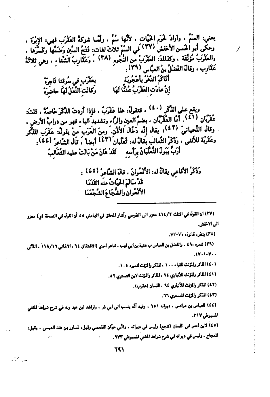 ويقع على الذكر فتقول: هذا عقرب، فإذا أردت الذكر خاصة قلت: عقربان، أما العقربان بضم العين والراء وتشديد الباء فهو من دواب الأرض، وقال اللحياني: يقال إنه دخان الأذن، ومن العرب من يقول: عقرب للذكر وعقربة للأنثى، وذكر الثعالب يقال له: ثعلبان أيضًا، قال الشاعر: