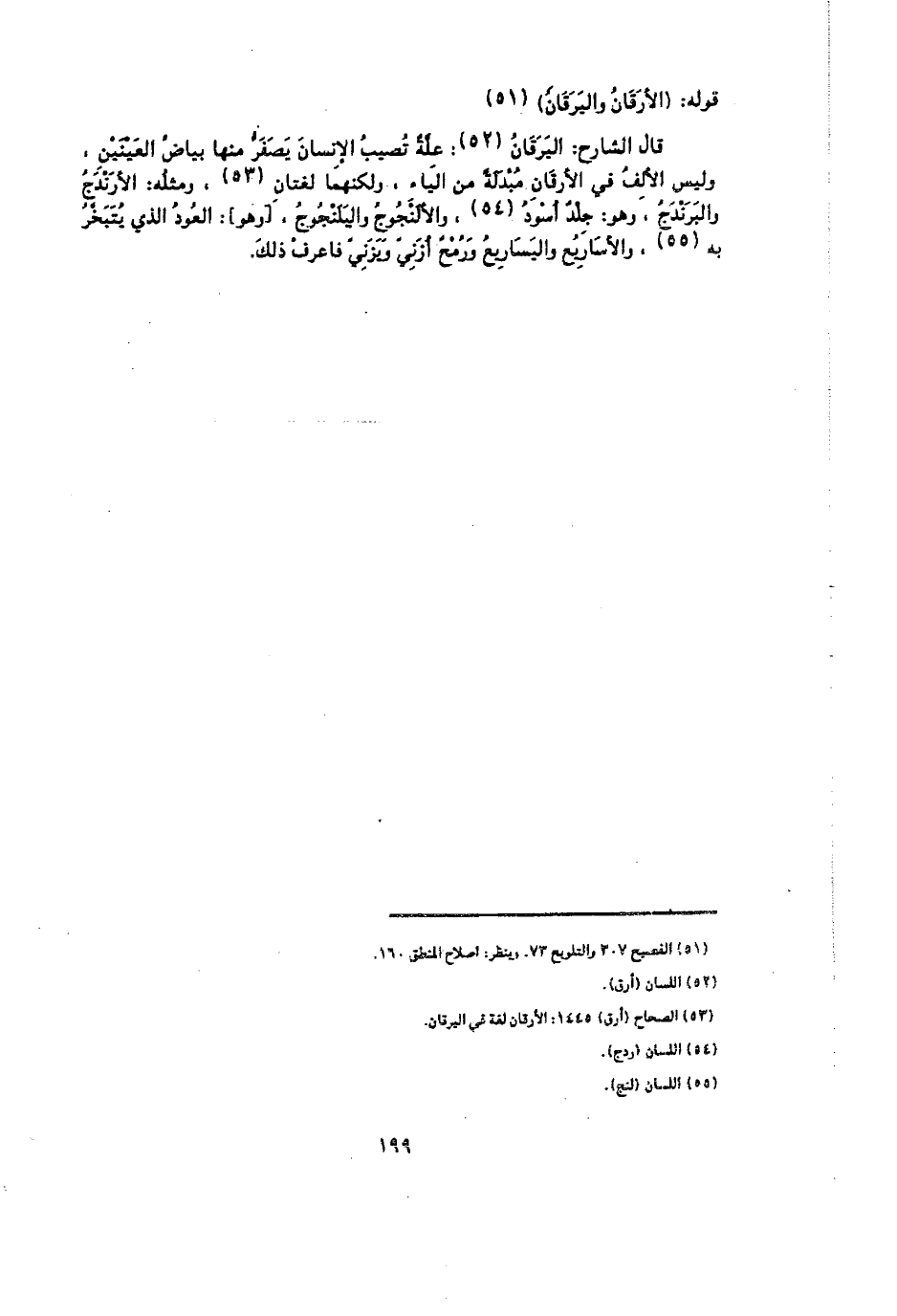 قال الشارح: اليرقان: علة تصيب الإنسان يصفر منها بياض العينين، وليس الألف في الأرقان مبدلة من الياء، ولكنهما لغتان، ومثله: الأرتدج والبرندج، وهو: جلد أسود، والألنجوج واليلنجوج، وهو: العود الذي يتبخر به، والأساريع واليساريع ورمح أزني ويزني فاعرف ذلك.