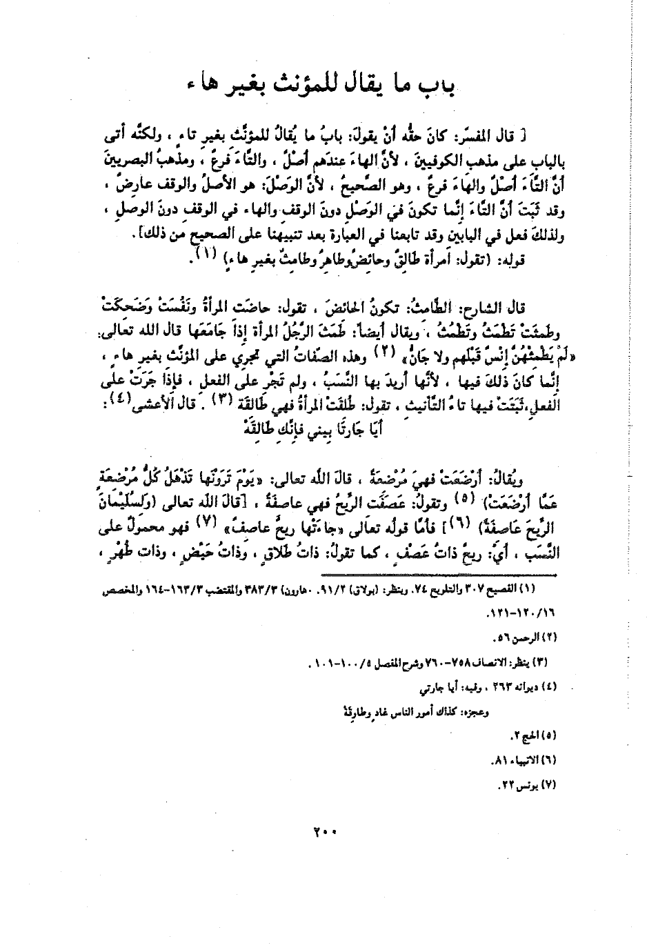 [قال المفسر: كان حقه أن يقول: باب ما يقال للمؤنث بغير تاء، ولكنه أتى بالبال على مذهب الكوفيين؛ لأن الهاء عندهم أصل، والتاء فرع، ومذهب البصريين أن التاء أصل والهاء فرع، وهو الصحيح؛ لأن الوصل: هو الأصل والوقف عارض، وقد ثبت أن التاء إنما تكون في الوصل دون الوقف والهاء في الوقف دون الوصل، ولذلك فعل في البابين وقد تابعنا في العبارة بعد تنبيهنا على الصحيح من ذلك].