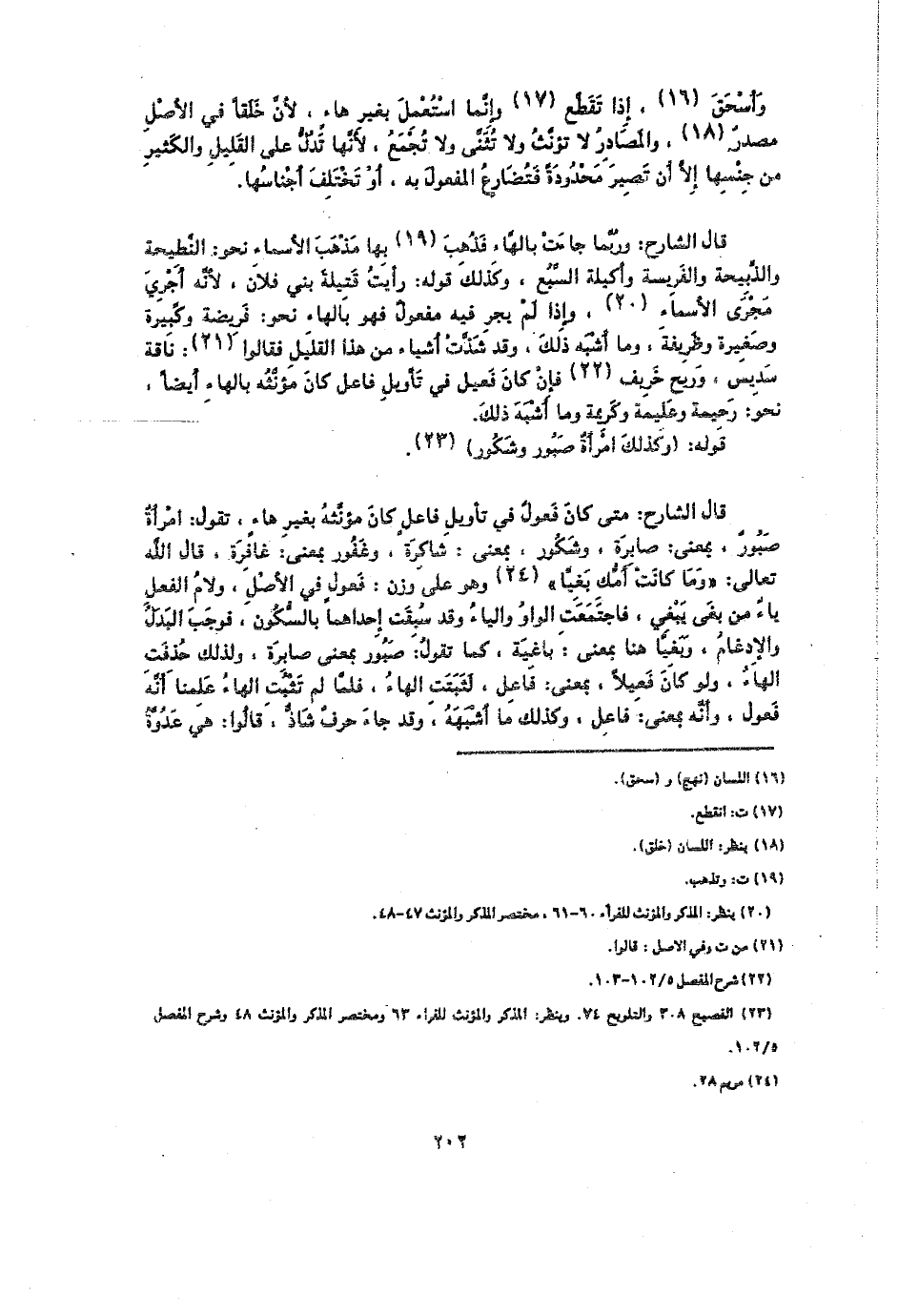 قال الشارح: وبما جاءت بالهاء فذهب بها مذهب الأسماء نحو: النطيحة والذبيحة والفريسة وأكيلة السبع، وكذلك قوله: رأيت قتيلة بني فلان؛ لأنه أجري مجرى الأسماء، وإذا لم يجر فيه مفعول فهو بالهاء نحو: فريضة وكبيرة وصغيرة وظريفة، وما أشبه ذلك، وقد شذت أشياء من هذا القليل فقالوا: ناقة سديس، وريح خريف، فإن كان فعيل في تأويل فاعل كان مؤنثه بالهاء أيضًا، نحو: رحيمة وعليمة وكريمة وما أشبه ذلك.