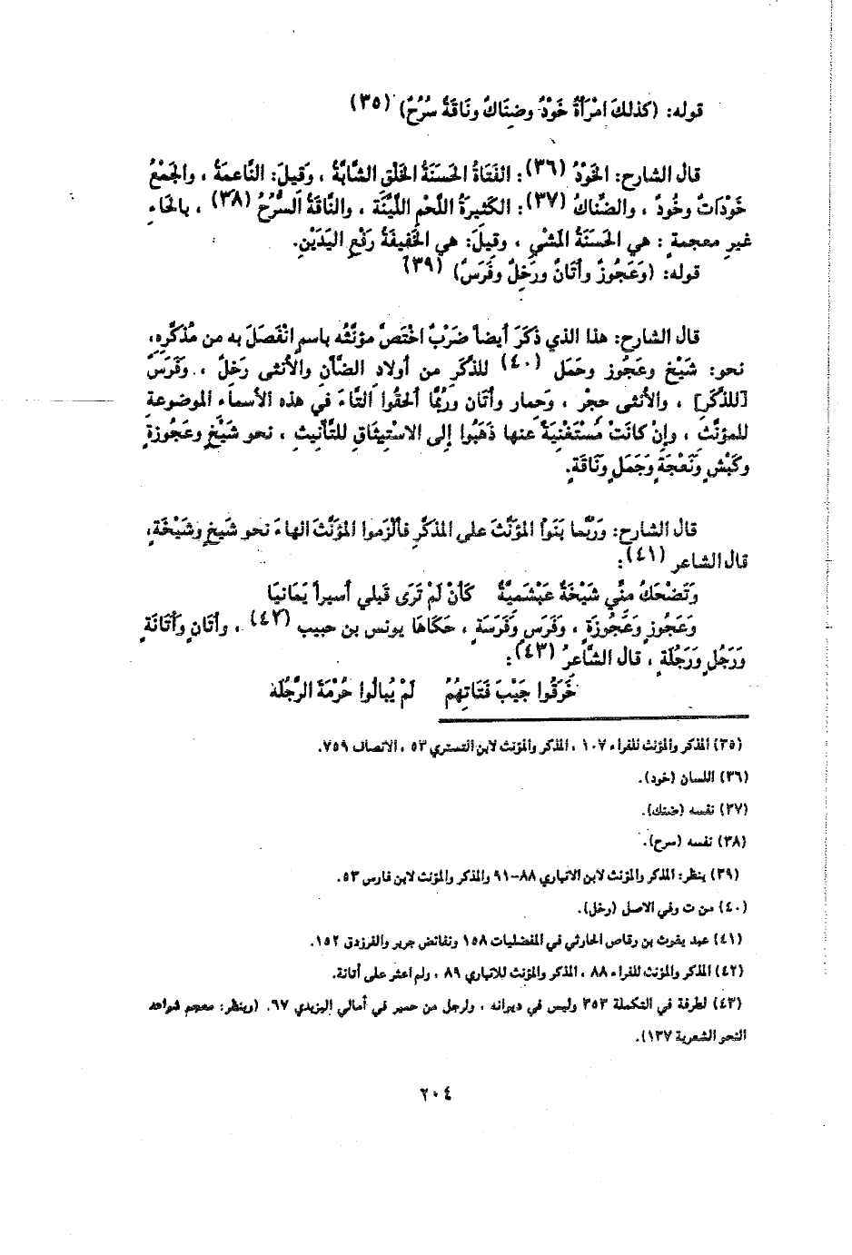 قال الشارح: هذا الذي ذكر أيضًا ضرب اختص مؤنثه باسم انفصل به من مذكره، نحو: شيخ وعجوز وحمل للذكر من أولاد الضأن والأنثى رخل، وفرس [للذكر]، والأنثى حجر، وحمار وأتان وربما ألحقوا التاء في هذه الأسماء الموضوعة للمؤنث، وإن كانت مستغنية عنها ذهبوا إلى الاستيثاق للتأنيث، نحو شيخ وعجوزة وكبش ونعجة وجمل وناقة.