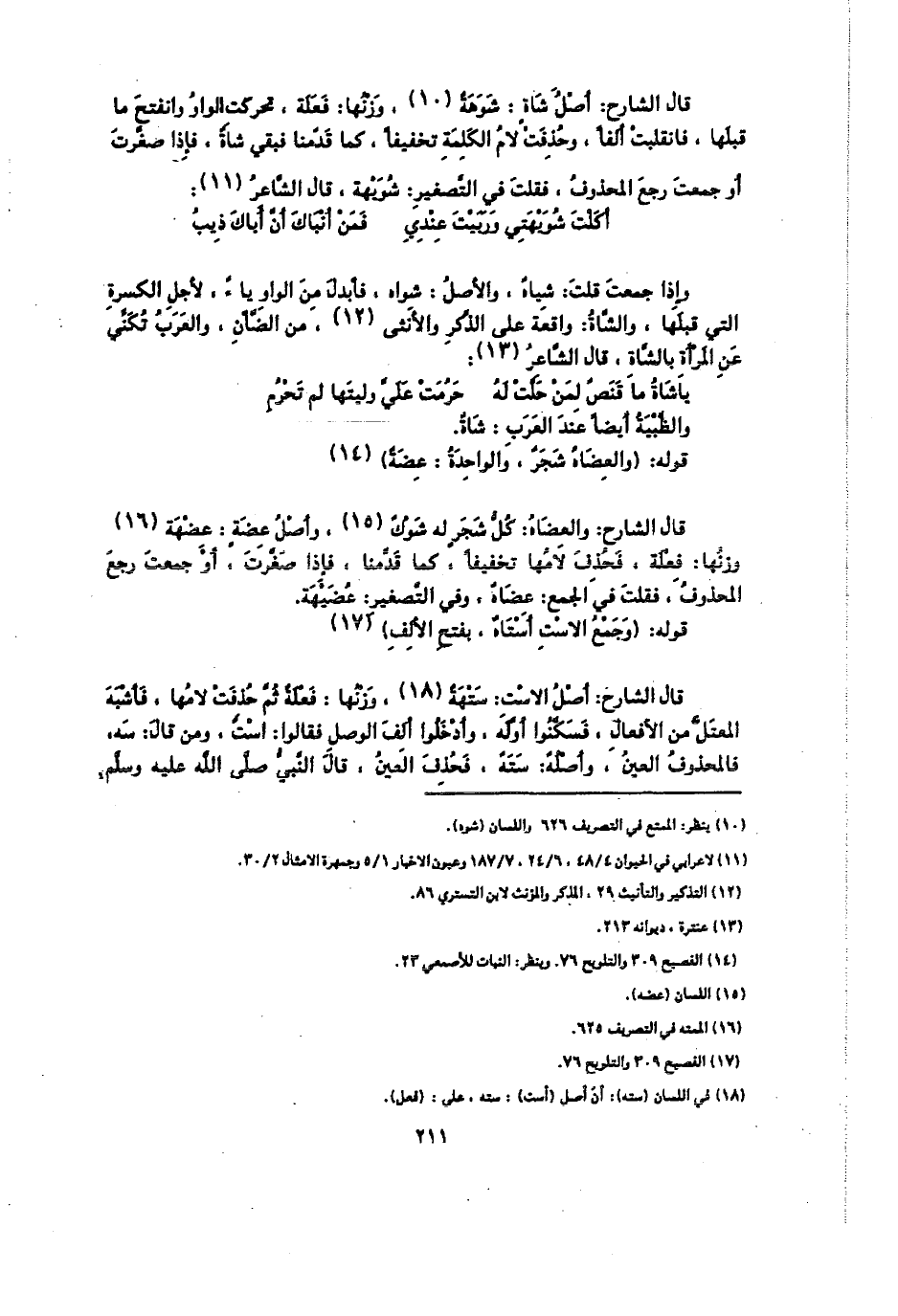 قال الشارح: والعضاة: كل شجر له شوك، وأصل عضة: عضهة، وزنها: فعلة، فحذف لامها تخفيفًا، كما قدمنا، فإذا صغرت أو جمعت رجع المحذوف، فقلت في الجمع: عضاة، وفي التصغير: عضيهة.