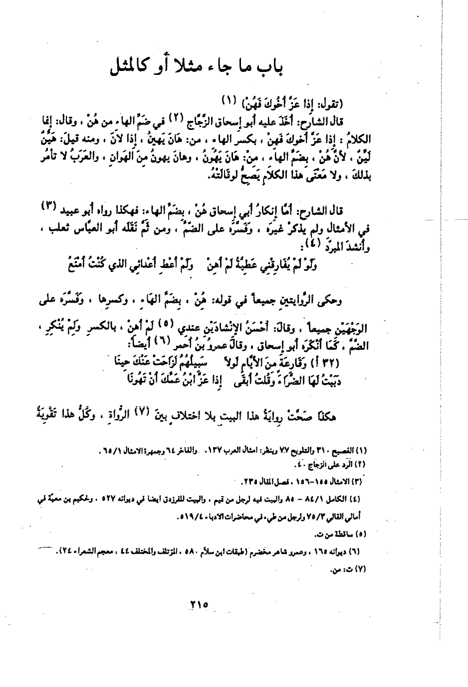 قال الشارح: أخذ عليه أبو إسحاق الزجاج في ضم الهاء من هن، وقال: إنما الكلام: إذا عز أخوك فهن، بكسر الهاء، من: هان يهين، إذا لان، ومنه قيل: هين لين؛ لأن هن بضم الهاء من: هان يهون، وهان يهون من الهوان، والعرب لا تأمر بذلك، ولا معنى هذا الكلام يصح لوقالته.