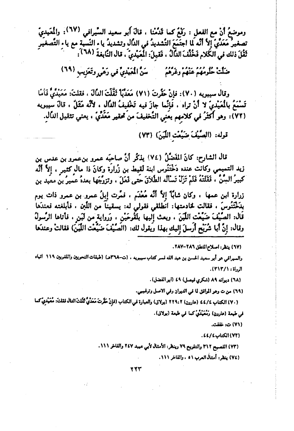 وقال سيبويه: فإن حقرت معديًا ثقلت الدال، فقلت: معيدي فأما تسمع بالمعيدي لا أن تراه، فإنما جاز فيه تخفيف الدال؛ لأنه مثل، قال سيبويه: وهو أكثر في كلامهم يعني التخفيف من تحقير معدي، يعني تثقيل الدال.
