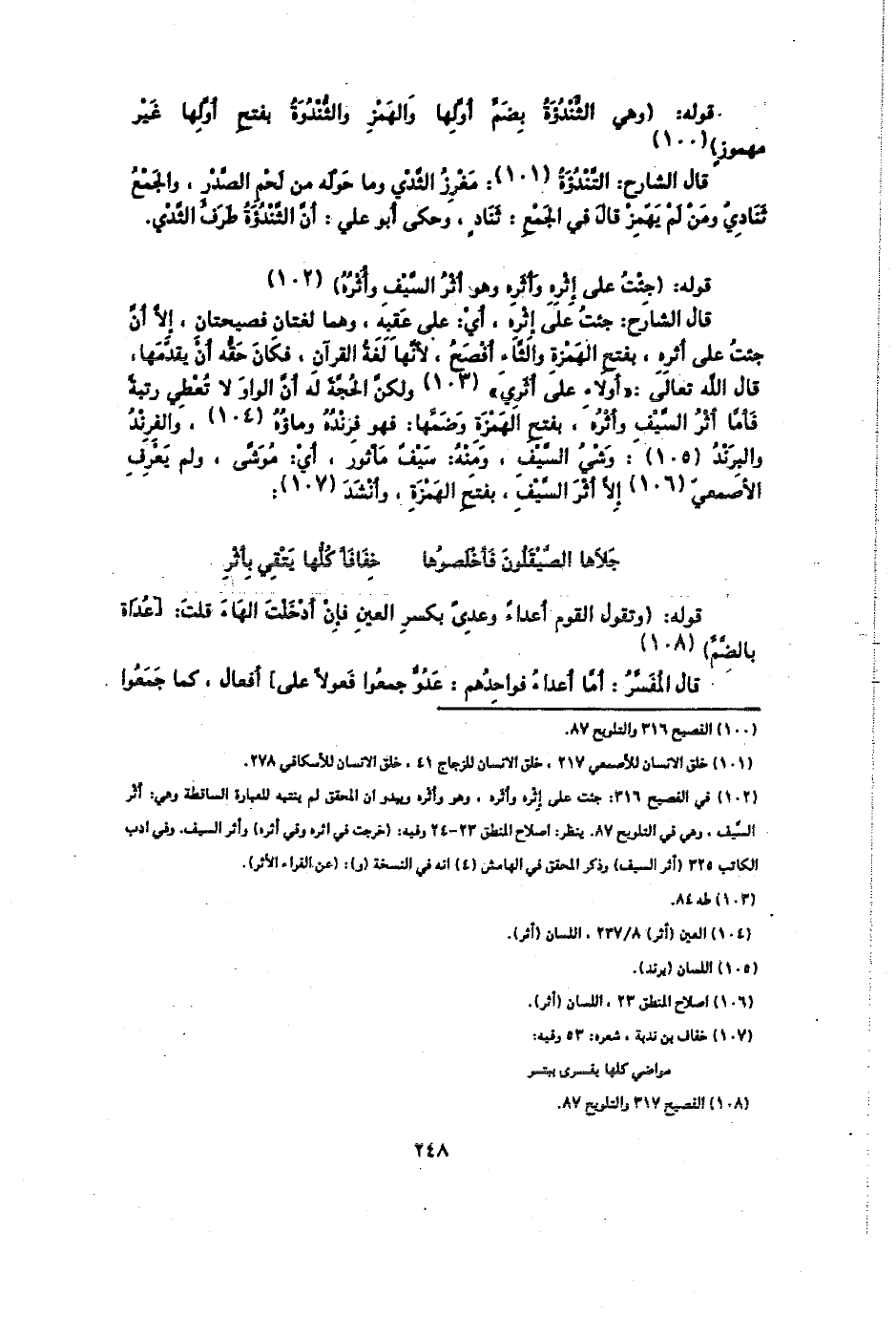 قال الشارح: جئت على إثره، أي: على عقبه، وهما لغتان فصيحتان، إلا أن جئت على أثره بفتح الهمزة والثاء أفصح؛ لأنها لغة القرآن، فكان حقه أن يقدمها، قال الله تعالى: {أُولَاءِ عَلَى أَثَرِي} [طه: 84]، ولكن الحجة له أن الواو لا تعطي رتبة، فأما أثر السيف وأثره، بفتح الهمزة وضمها: فهو فرنده وماؤه، والفرند والبرند: وشي السيف، ومنه: سيف مأثور، أي: موشى، ولم يعرف الأصمعي إلا أثر السيف، بفتح الهمزة، وأنشد: