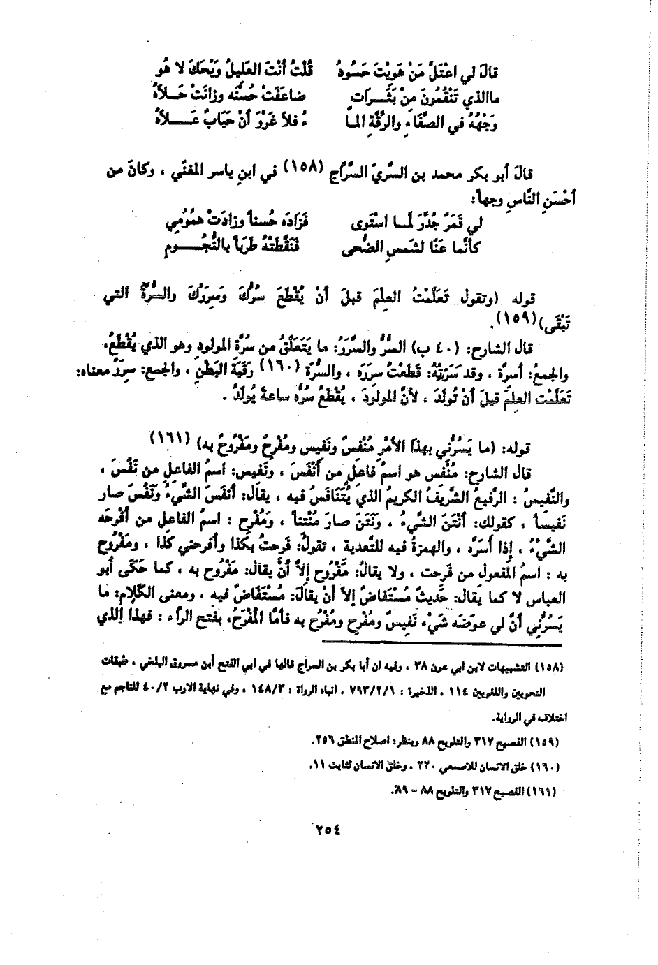 قال الشارح: منفس هو اسم فاعل من أنفس، ونفيس: اسم الفاعل من نفس، والنفيس: الرفيع الشريف الكريم الذي يتنافس فيه، يقال: أنفس الشيء ونفس صار نفيسا، كقولك: أنتن الشيء، ونتن صار منتنا، ومفرح: اسم الفاعل من أفرحه الشيء، إذا أسره، والهمزة فيه للتعدية، تقول: فرحت بكذا وأفرحني كذا، ومفروح به: اسم المفعول من فرحت، ولا يقال: مفروح إلا أن يقال: مفروح به، كما حكى أبو العباس لا كما يقال: حديث مستفاض إلا أن يقال: مستفاض فيه، ومعنى الكلام: ما يسرني أن لي عوضه شيء نفيس ومفرح ومفرح به فأما المفرح، بفتح الراء: فهذا الذي