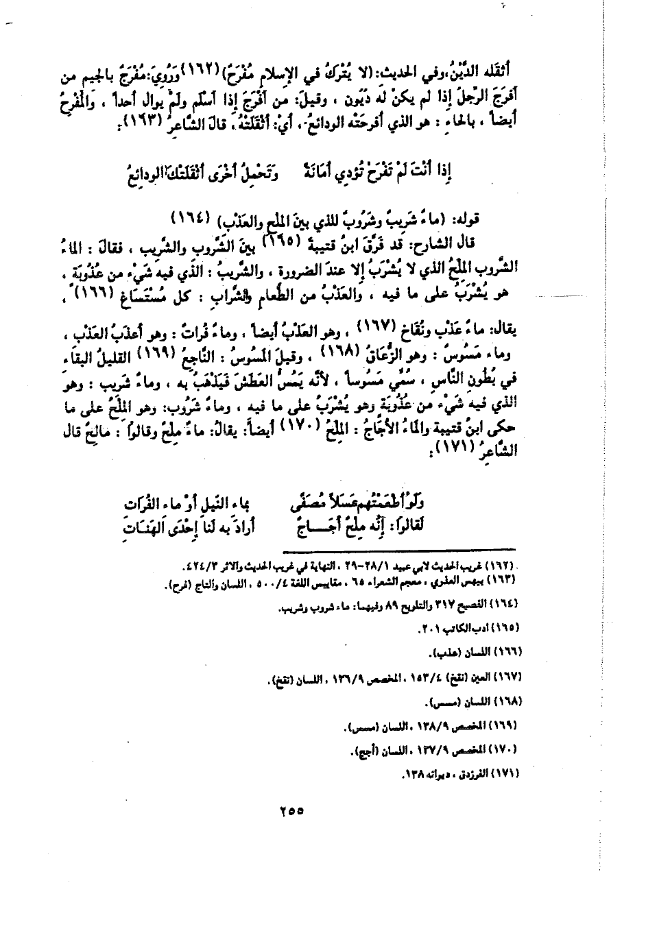 يقال: ماء عذب ونقاخ، وهو العذب أيضا، وماء فرات: وهو أعذب العذب، وماء مسوس: وهو الزعاق، وقيل المسوس: الناجح القليل البقاء في بطون الناس، سمى مسوسا، لأنه يمس العطش فيذهب به، وماء شريب: وهو الذي فيه شيء من عذوبة وهو يشرب على ما فيه، وماء شروب: وهو الملح على ما حكى ابن قتيبة والماء الأجاج: الملح أيضا: يقال: ماء ملح وقالوا: مالح قال الشاعر: