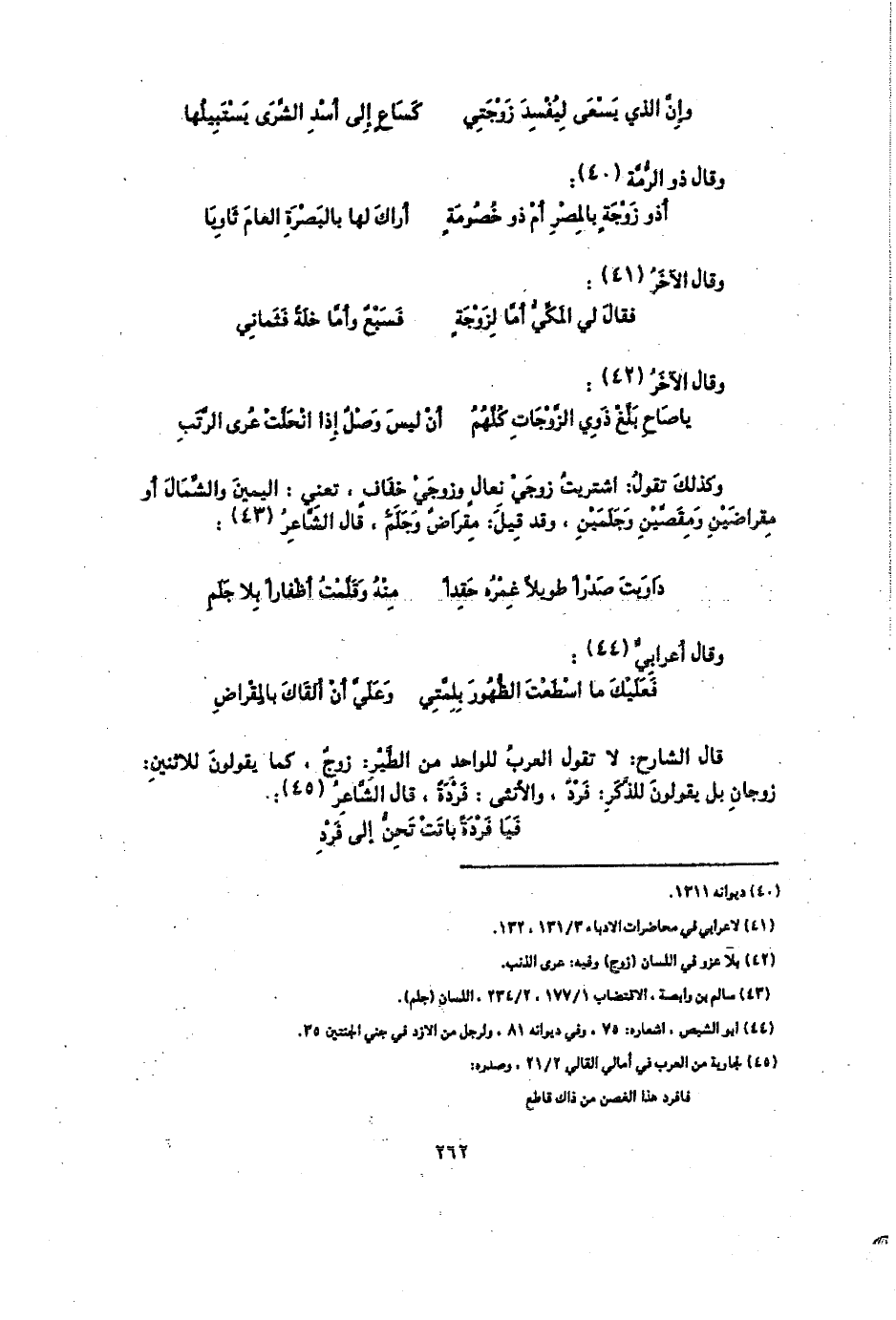 قال الشارح: لا تقول العرب للواحد من الطير: زوج، كما يقولون للاثنين: زوجان بل يقولون للذكر: فرد، والأنثى: فردة، قال الشاعر:
