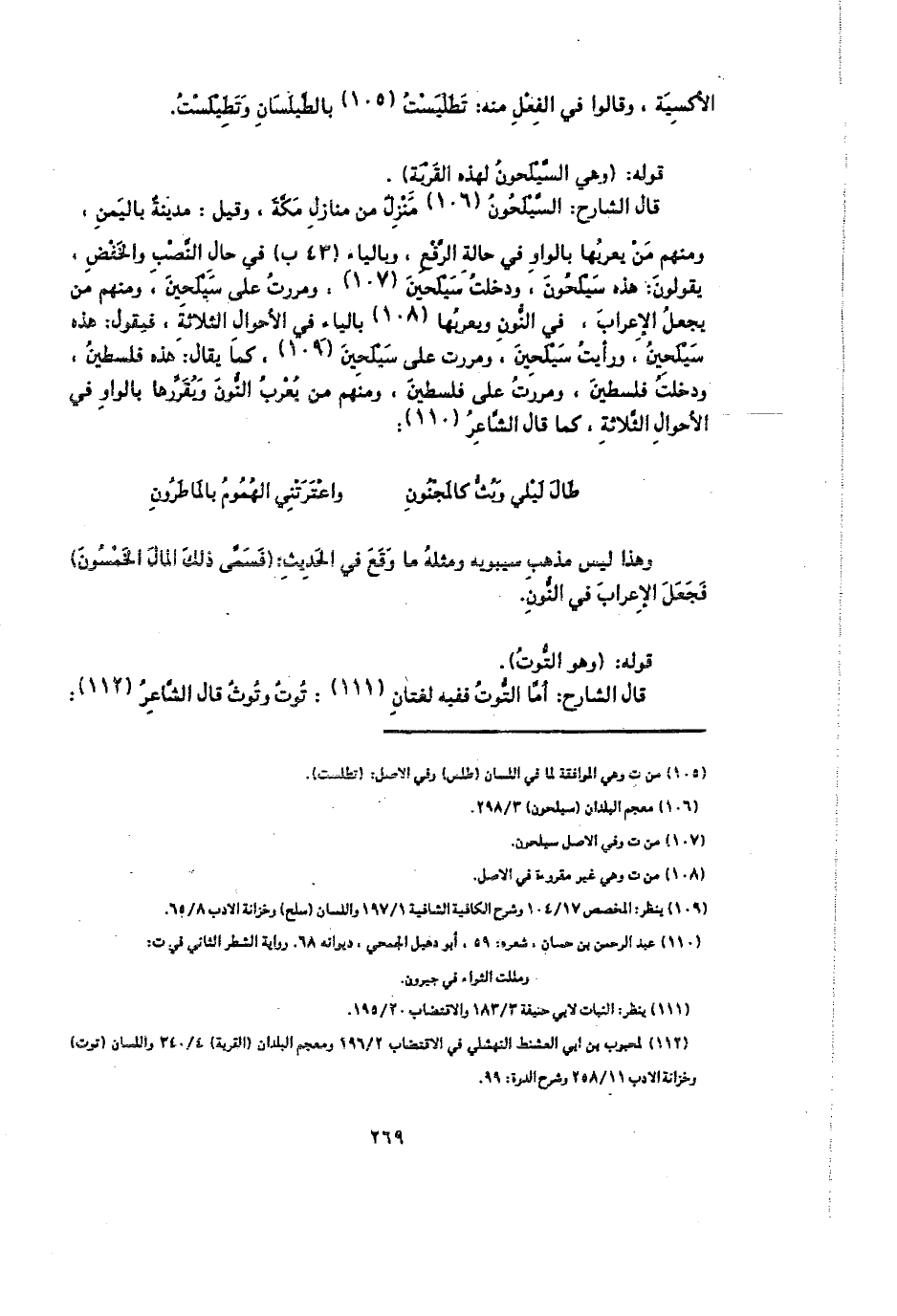 قال الشارح: السيلحون منزل من منازل مكة، وقيل: مدينة باليمن، ومنهم من يعربها بالواو في حالة الرفع، وبالياء (43 ب) في حال النصب والخفض، يقولون: هذا سيلحون، ودخلت سيلحين، ومررت على سبلحين، ومنهم من يجعل الإعراب، في النون ويعربها بالياء في الأحوال الثلاثة، فيقول: هذه سيلحين، ورأيت سيلحين، ومررت على سيلحين، كما يقال: هذه فلسطين، ودخلت فلسطين، ومررت على فلسطين، ومنهم من يعرب النون ويقررها بالواو في الأحوال الثلاثة، كما قال الشاعر:
