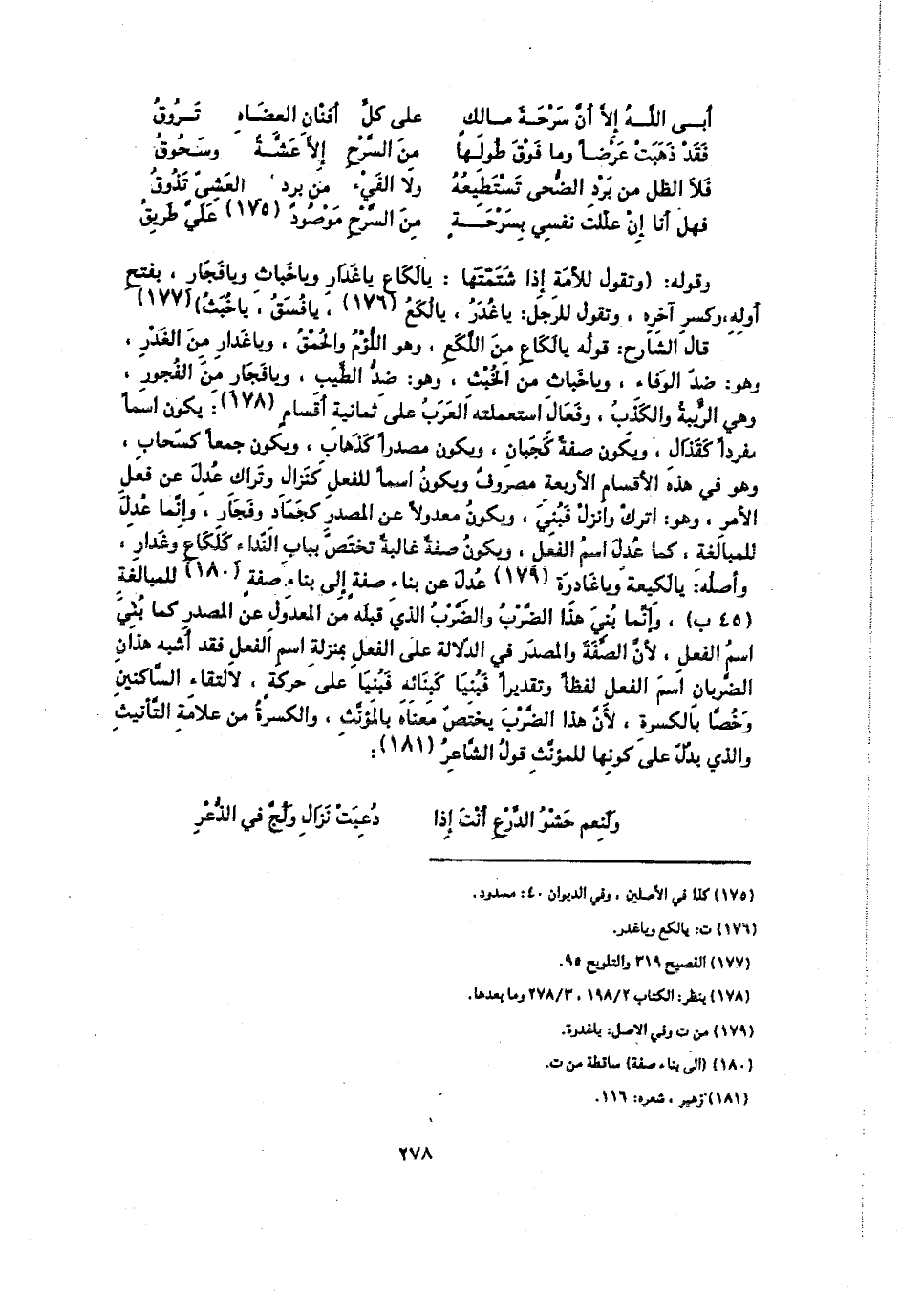قال الشارح: قوله يا لكاع من اللكع، وهو اللوم والحمق، ويا غدار من الغدر، وهو: ضد الوفاء، ويا خباث من الخبث، وهو: ضد الطيب، ويا فجار من الفجور، وهي الريبة والكذب، وفعال استعملته العرب على ثمانية أقسام: يكون اسما مفردا كقذال، ويكون صفة كجبان، ويكون مصدرا كذهاب، ويكون جمعا كسحاب، وهو في هذه الأقسام الأربعة مصروف ويكون اسما للفعل كنزال وتراك عدل من فعل الأمر، وهو: اترك وانزل فبني، ويكون معدولا عن المصدر كجماد وفجار، وإنما عدل للمبالغة، كما عدل اسم الفعل، ويكون صفة غالب تختص بباب النداء كلكاع وغدار، وأصله: يا لكيعة ويا غادرة عدل عن بناء صفة إلى بناء صفة للمبالغة، وإنما بني هذا الضرب والضرب الذي قبله من المعدول عن المصدر كما بني اسم الفعل، لأن الصفة والمصدر في الدلالة على الفعل بمنزلة اسم الفعل فقد أشبه هذان الضربان اسم الفعل لفظا وتقديرا فبنيا كبنائه فبنيا على حركة، لالتقاء الساكنين وخصا بالكسرة، لأن هذا الضرب يختص معناه بالمؤنث، والكسرة من علامة التأنيث والذي يدل على كونها للمؤنث قول الشاعر: