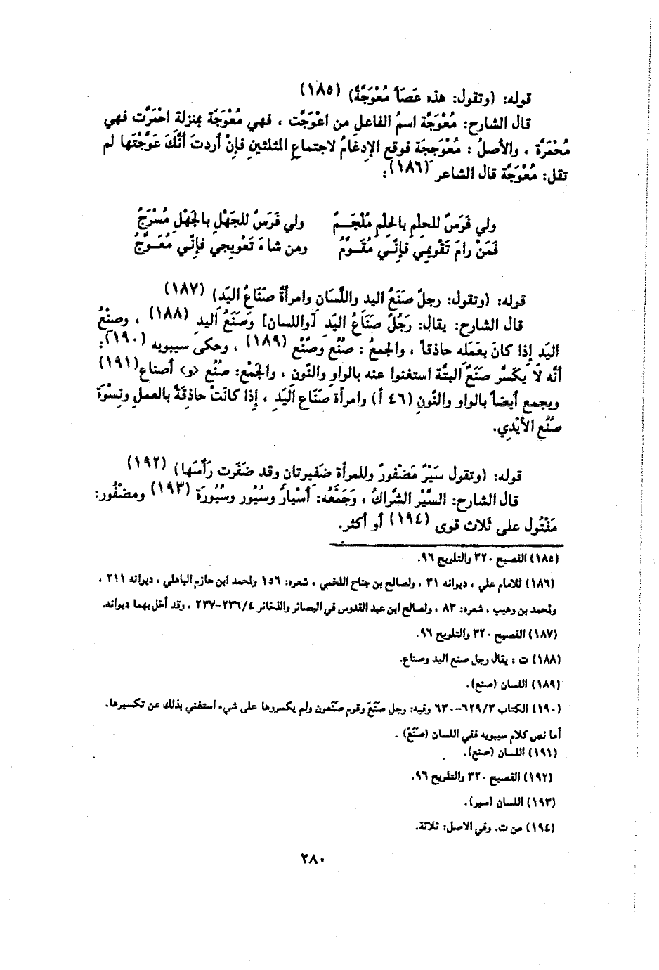 (قال الشارح: يقال: رجل صناع اليد [واللسان] وصَنَعُ اليد، وصنْعُ اليد إذا كان بعمله حاذقا، والجمع: صنُع وصنْع، وحكى سيبويه: أنه لا يكسر صنع البتة استغنوا عنه بالواو والنون، والجمع: صنع (و) أصناع ويجمع أيضا بالواو والنون (46 أ) وامرأة صناع اليد، إذا كانت حاذفة بالعمل ونسوة صناع الأيدي.