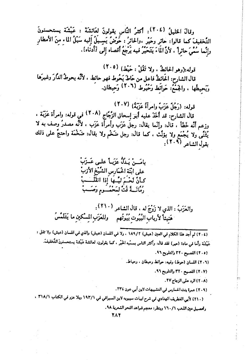 وقال الخليل: أكثر الناس يقولون لعائشة: عيشة يستحسنون التخفيف كما قالوا: حائر وحير، والحائر: حوض يسيل إليه سيل الماء من الأمطار وإنما سمي حائرًا، لأن الماء يتحير فيه يرجع أقصاه إلى (أدناه).