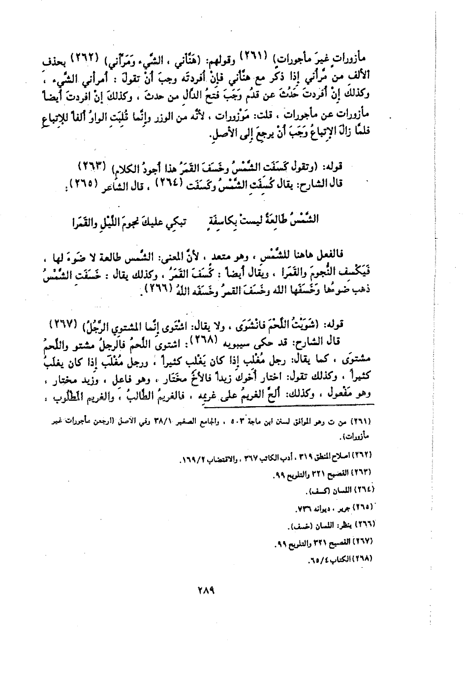 مأزورات غير مأجورات) وقولهم: (هنأني، الشيء ومرأني) بحذف الألف من مراني إذا ذكر مع هنأني فإن أفردته وجب أن تقول: امرأني الشيء، وكذلك إن أفردت حدث عن قدم وجب فتح الدال من حدث، وكذلك إن افردت أيضا مأزورات عن مأجورات، قلت: موزورات، لأنه من الوزر وإنما قلبت الواو ألفا للاتباع فلما زال الاتباع وجب أن يرجع إلى الأصل.