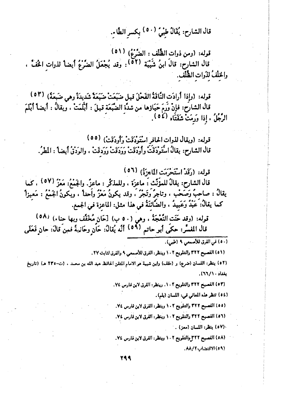 قال الشارح: يقال للمؤنث: ماعزة، وللمذكر: ماعز. والجمع: معز، كما يقال: صاحب وصحب، وتاجر وتجر، وقد يكون معز واحدا، ويكون الجمع: معيزا كما يقال: عبد وعبيد، والضائنة في هذا مثل: الماعزة في الجمع.