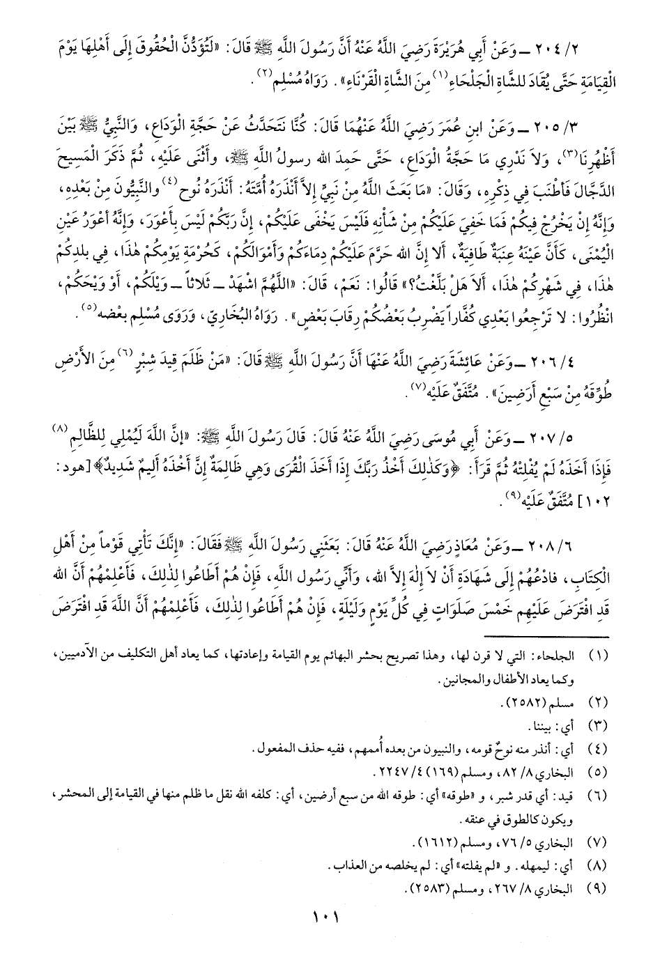 2/204- وعن أَبِي هريرة رضي اللَّه عنه أَن رسولَ اللَّه صَلّى اللهُ عَلَيْهِ وسَلَّم قَالَ: "لَتُؤَدُّنَّ الْحُقُوقَ إِلَى أَهْلِهَا يَوْمَ الْقيامَةِ حَتَّى يُقَادَ للشَّاةِ الْجَلْحَاء مِنَ الشَّاةِ الْقَرْنَاء" رواه مسلم.