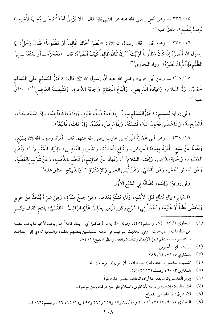 15/236- وعن أَنسٍ رضي اللَّه عنه عن النَّبيّ صَلّى اللهُ عَلَيْهِ وسَلَّم قَالَ: "لا يُؤْمِنُ أَحدُكُمْ حتَّى يُحِبَّ لأَخِيهِ مَا يُحِبُّ لِنَفْسِهِ" متفقٌ عليه.