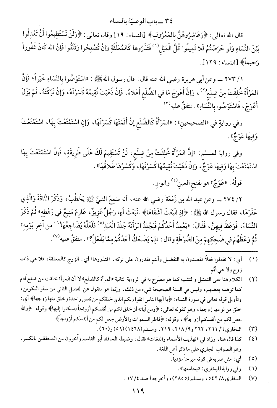 1/273-وعن أبي هريرةَ رضي اللَّه عنه قَالَ: قالَ رسول ُ اللَّه صَلّى اللهُ عَلَيْهِ وسَلَّم: "اسْتوْصُوا بِالنِّساءِ خيْراً، فإِنَّ المرْأَةَ خُلِقَتْ مِنْ ضِلَعٍ، وَإِنَّ أَعْوجَ مَا في الضِّلعِ أَعْلاهُ، فَإِنْ ذَهبتَ تُقِيمُهُ كَسرْتَهُ، وإِنْ تركتَهُ، لمْ يزلْ أَعوجَ، فاستوْصُوا بِالنِّسَاءِ" متفقٌ عَلَيهِ.