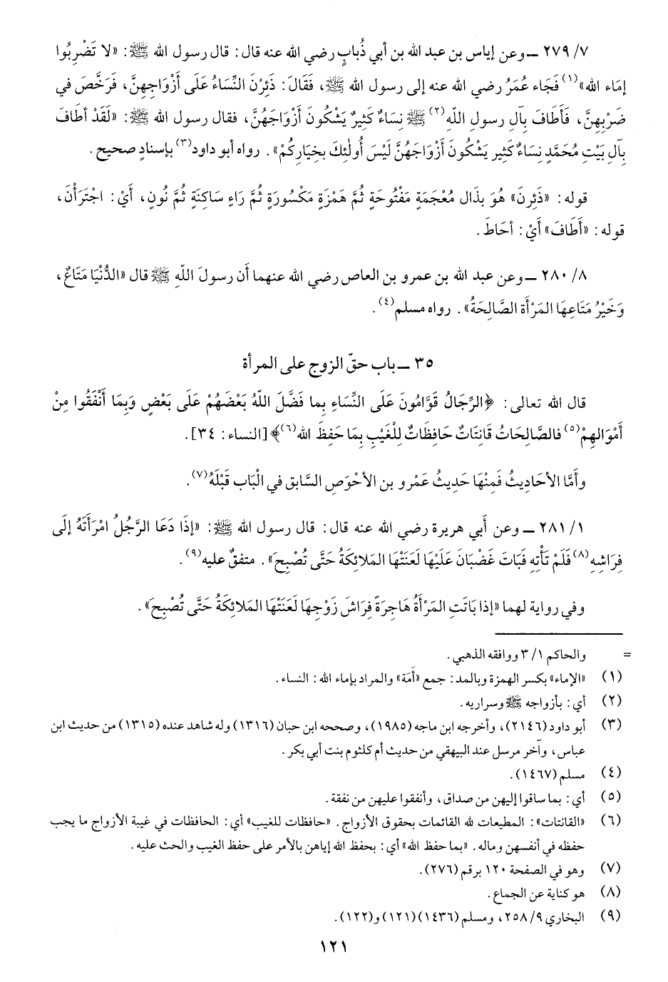 7/279-وعن إِياس بنِ عبدِ اللَّه بنِ أَبي ذُباب رضي اللَّه عنه قَالَ: قَالَ رسولُ اللَّه صَلّى اللهُ عَلَيْهِ وسَلَّم: "لاَ تَضْربُوا إِمَاءَ اللَّهِ" فَجاءَ عُمَرُ رضي اللَّه عنه إِلى رسولِ اللَّه صَلّى اللهُ عَلَيْهِ وسَلَّم، فَقَالَ: ذَئِرْنَ النِّساءُ عَلَى أَزْواجهنَّ، فَرَخَّصَ في ضَرْبهِنَّ فَأَطاف بِآلِ رسولِ اللَّه صَلّى اللهُ عَلَيْهِ وسَلَّم نِساءٌ كَثِيرٌ يَشْكونَ أَزْواجهُنَّ، فَقَالَ رَسُول اللَّه صَلّى اللهُ عَلَيْهِ وسَلَّم: "لَقَدْ أَطَافَ بآلِ بَيْت مُحمَّدٍ نِساءٌ كَثيرِ يشْكُونَ أَزْوَاجَهُنَّ لَيْسَ أُولِئك بخيارِكُمْ" رواه أَبُو داود بإسنادٍ صحيح.