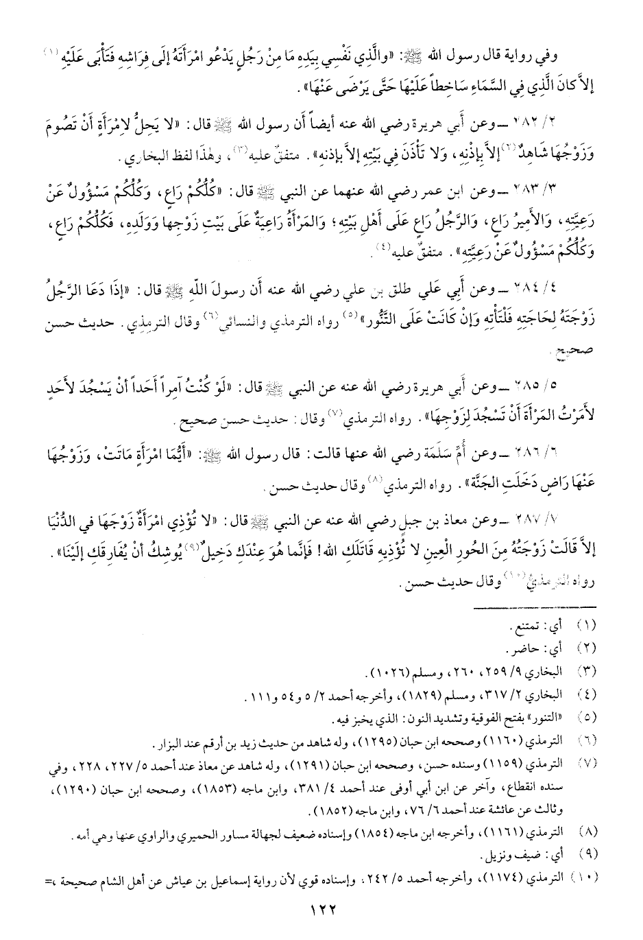 4/284- وعن أَبي عليٍّ طَلْق بن عليٍّ رضي اللَّه عنه أَن رسولَ اللَّه صَلّى اللهُ عَلَيْهِ وسَلَّم قَالَ: "إِذَا دَعَا الرَّجُلُ زَوْجتَهُ لِحَاجتِهِ فَلْتَأْتِهِ وإِنْ كَانَتْ عَلَى التَّنُّور". رواه الترمذي والنسائي، وَقالَ الترمذي: حديث حسن صحيح.