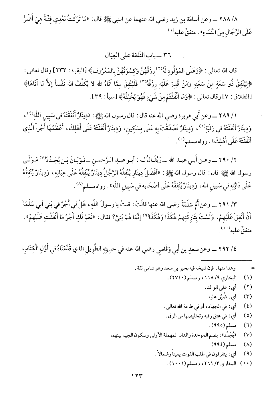 2/290-وعن أَبي عبدِ اللَّهِ وَيُقَالُ له: أبي عبدِ الرَّحمن ثَوْبانَ بْن بُجْدُدَ مَوْلَى رسولِ اللَّه صَلّى اللهُ عَلَيْهِ وسَلَّم قَالَ: قَالَ رسولُ اللَّه صَلّى اللهُ عَلَيْهِ وسَلَّم: "أَفْضَلُ دِينَارٍ يُنْفِقُهُ الرَّجُلُ دِينَارٌ يُنْفِقُهُ عَلَى عِيالِهِ، وَدِينَارٌ يُنْفِقُهُ عَلَى دابَّتِهِ في سبيلِ اللَّه، ودِينَارٌ يُنْفِقُهُ علَى أَصْحابه في سبِيلِ اللَّهِ" رواه مسلم.