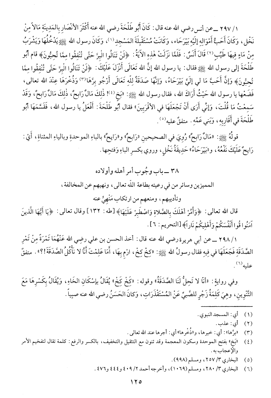 1/297- عن أَنس رضي اللَّه عنه قَالَ: كَانَ أَبُو طَلْحَةَ رضي اللَّه عنه أَكْثَر الأَنْصَارِ بِالمدِينَةِ مَالاً مِنْ نَخْلٍ، وَكَانَ أَحَبُّ أَمْوالِهِ إِلَيْهِ بَيْرَحاءَ، وَكانَتْ مُسْتَقْبِلَةَ المسْجِدِ وكانَ رسولُ صَلّى اللهُ عَلَيْهِ وسَلَّم يدْخُلُهَا وَيشْربُ مِنْ ماءٍ فِيهَا طَيِّبٍ قَالَ أَنَسٌ: فلَمَّا نزَلَتْ هَذِهِ الآيةُ: {لَنْ تَنَالُوا الْبِرَّ حتَّى تُنْفِقُوا مِمَّا تُحِبُّونَ} قام أَبُو طَلْحَةَ إِلى رسولِ اللَّه صَلّى اللهُ عَلَيْهِ وسَلَّم فقال: يارسولَ اللَّه إِنَّ اللَّه تَعَالَى أَنْزَلَ عَلَيْكَ: {لَنْ تَنَالُوا الْبِرَّ حتَّى تُنْفِقُوا مِمَّا تُحِبُّونَ} وَإِنَّ أَحَبَّ مَالي إِلَيَّ بَيْرَحَاءَ، وإِنَّهَا صَدقَةٌ للَّهِ تَعَالَى أَرْجُو بِرَّهَا وذُخْرهَا عِنْد اللَّه تَعَالَى، فَضَعْها يَا رَسُول اللَّه حيْثُ أَرَاكَ اللَّهُ، فقال رَسُول اللَّه صَلّى اللهُ عَلَيْهِ وسَلَّم: "بَخٍ، ذلِكَ مَالٌ رَابحٌ، ذلِكَ مَالٌ رَابِحٌ، وَقَدْ سمِعْتُ مَا قُلْتَ، وَإِنِّي أَرَى أَنْ تَجْعَلَهَا في الأَقْرَبِينَ" فَقَالَ أَبُو طَلْحَةَ: أَفْعَلُ يَا رسولَ اللَّه، فَقَسَّمَهَا أَبُو طَلْحَةَ في أَقَارِبِهِ، وَبَني عَمِّهِ. متفقٌ عَلَيهِ.