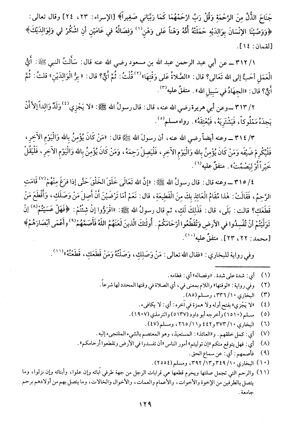 1/312- عن أبي عبد الرحمن عبد اللَّه بن مسعود رضي اللَّه عنه قَالَ: سأَلتُ النبي صَلّى اللهُ عَلَيْهِ وسَلَّم: أَيُّ الْعملِ أَحبُّ إِلَى اللَّهِ تَعالى؟ قَالَ: "الصَّلاةُ عَلَى وقْتِهَا"قُلْتُ: ثُمَّ أَيُّ؟ قَالَ:"بِرُّ الْوَالِديْنِ"قلتُ: ثُمَّ أَيُّ؟ قَالَ:"الجِهَادُ في سبِيِل اللَّهِ" متفقٌ عَلَيهِ.