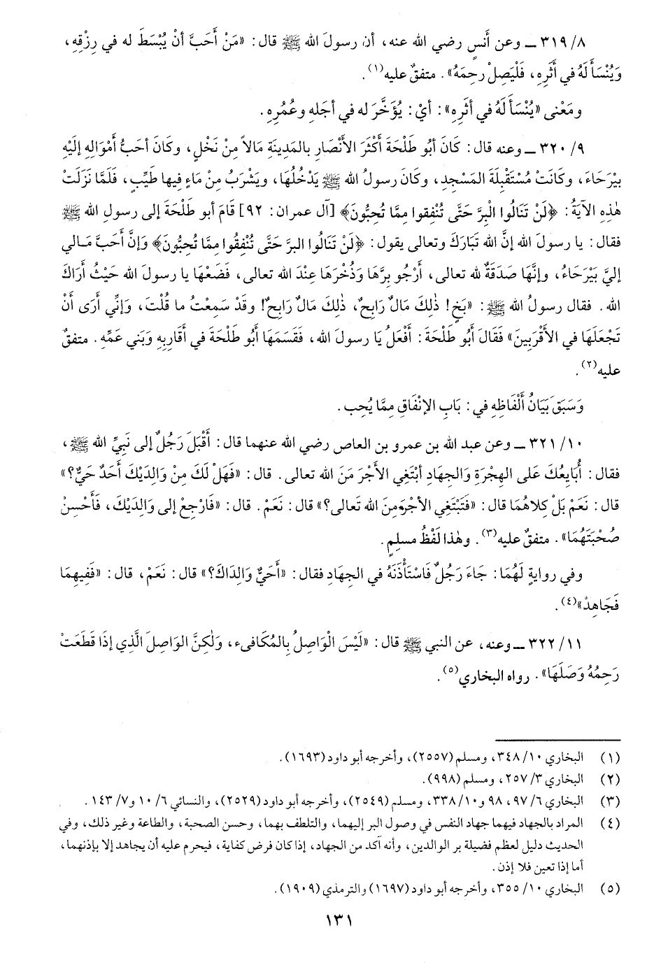 8/319- وعن أَنسٍ رضي اللَّه عنه أَن رسولَ اللَّه صَلّى اللهُ عَلَيْهِ وسَلَّم قَالَ: "مَنْ أَحبَّ أَنْ يُبْسَطَ لَهُ في رِزقِهِ، ويُنْسأَ لَهُ في أَثرِهِ، فَلْيصِلْ رحِمهُ" متفقٌ عَلَيهِ.