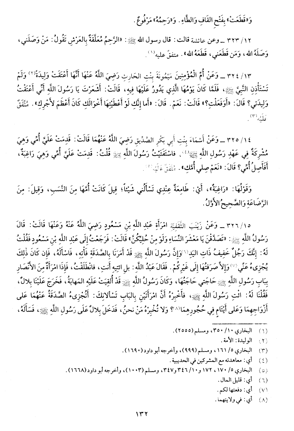 14/325-وعن أَسْمَاءَ بنْتِ أَبي بكْرٍ الصِّدِّيقِ رضي اللَّه عنهما قَالَتْ: قَدِمتْ عليَّ أُمِّي وهِي مُشركة في عهْدِ رسولِ اللَّه صَلّى اللهُ عَلَيْهِ وسَلَّم فَاسْتَفتَيْتُ رَسُول اللَّه صَلّى اللهُ عَلَيْهِ وسَلَّم قلتُ: قَدِمتْ عَليَّ أُمِّى وَهِى راغبةٌ، أَفأَصِلُ أُمِّي؟ قَالَ:"نَعمْ صِلي أُمَّكِ" مُتَّفَقٌ عَلَيهِ.