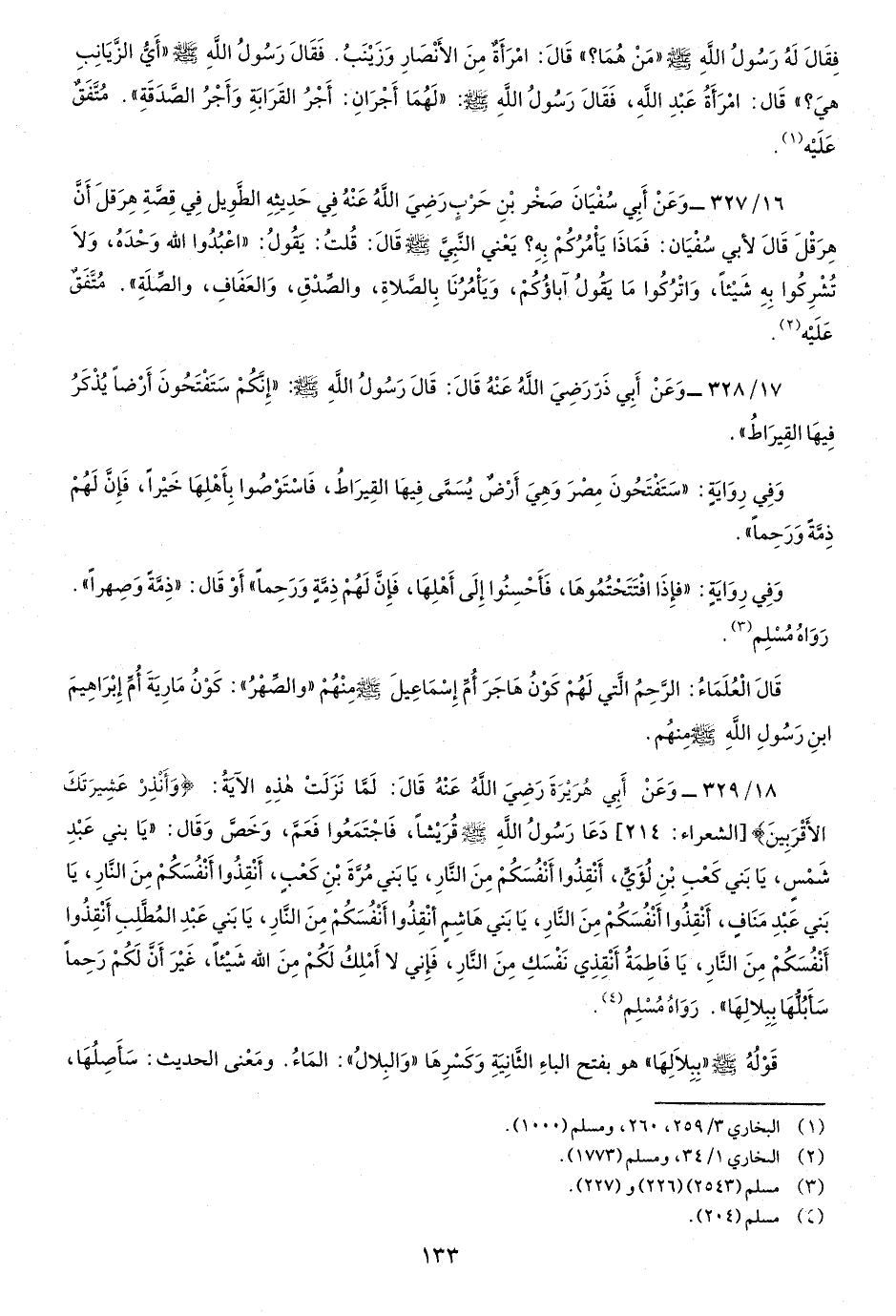 16/327- وعن أَبي سُفْيان صخْر بنِ حربٍ رضي اللَّه عنه في حدِيثِهِ الطَّويل في قصَّةِ هِرقل أَنَّ هِرقْلَ قَالَ لأَبي سفْيان: فَماذَا يأْمُرُكُمْ بِهِ؟ يَعْني النَّبِيَّ صَلّى اللهُ عَلَيْهِ وسَلَّم قَالَ: قُلْتُ: يقولُ:"اعْبُدُوا اللَّهَ وَحدَهُ، وَلاَ تُشْرِكُوا بِهِ شَيْئاً، واتْرُكُوا مَا يقُولُ آباؤُكمْ، ويأْمُرُنَا بالصَّلاةِ، والصِّدْقِ، والعفَافِ، والصِّلَةِ"متفقٌ عَلَيهِ.