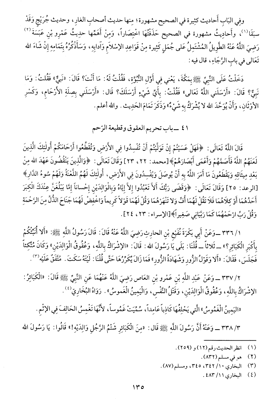 2/337-وعن عبد اللَّهِ بنِ عمرو بن العاص رضي اللَّه عنهما عن النَّبي صَلّى اللهُ عَلَيْهِ وسَلَّم قَالَ: "الْكبائرُ: الإِشْراكُ بِاللَّه، وعقُوق الْوالِديْنِ، وقَتْلُ النَّفْسِ، والْيمِينُ الْغَموس" رواه البخاري.