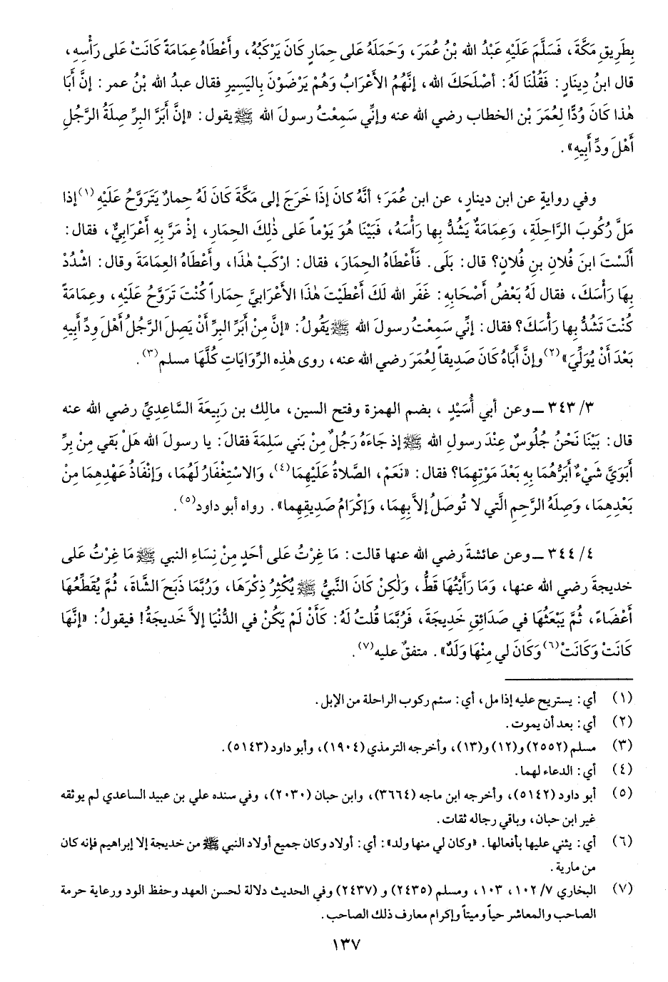 3/343-وعن أَبي أُسَيْد بضم الهمزة وفتح السين مالكِ بنِ ربِيعَةَ السَّاعِدِيِّ رضي اللَّه عنه قَالَ: بَيْنا نَحْنُ جُلُوسٌ عِنْدَ رَسُول اللَّهِ صَلّى اللهُ عَلَيْهِ وسَلَّم إذ جاءَهُ رجُلٌ مِنْ بني سَلَمة فقالَ: يارسولَ اللَّه هَلْ بَقِيَ مِن بِرِّ أَبويَّ شىءٌ أَبرُّهُمَا بِهِ بَعدَ مَوْتِهِمَا؟ فَقَالَ: "نَعَمْ، الصَّلاَة علَيْهِمَا، والاسْتِغْفَارُ لَهُما، وإِنْفاذُ عَهْدِهِما مِنْ بَعْدِهِما، وصِلةُ الرَّحِمِ الَّتي لا تُوصَلُ إِلاَّ بِهِمَا، وإِكَرَامُ صَدِيقهما" رواه أَبُو داود.