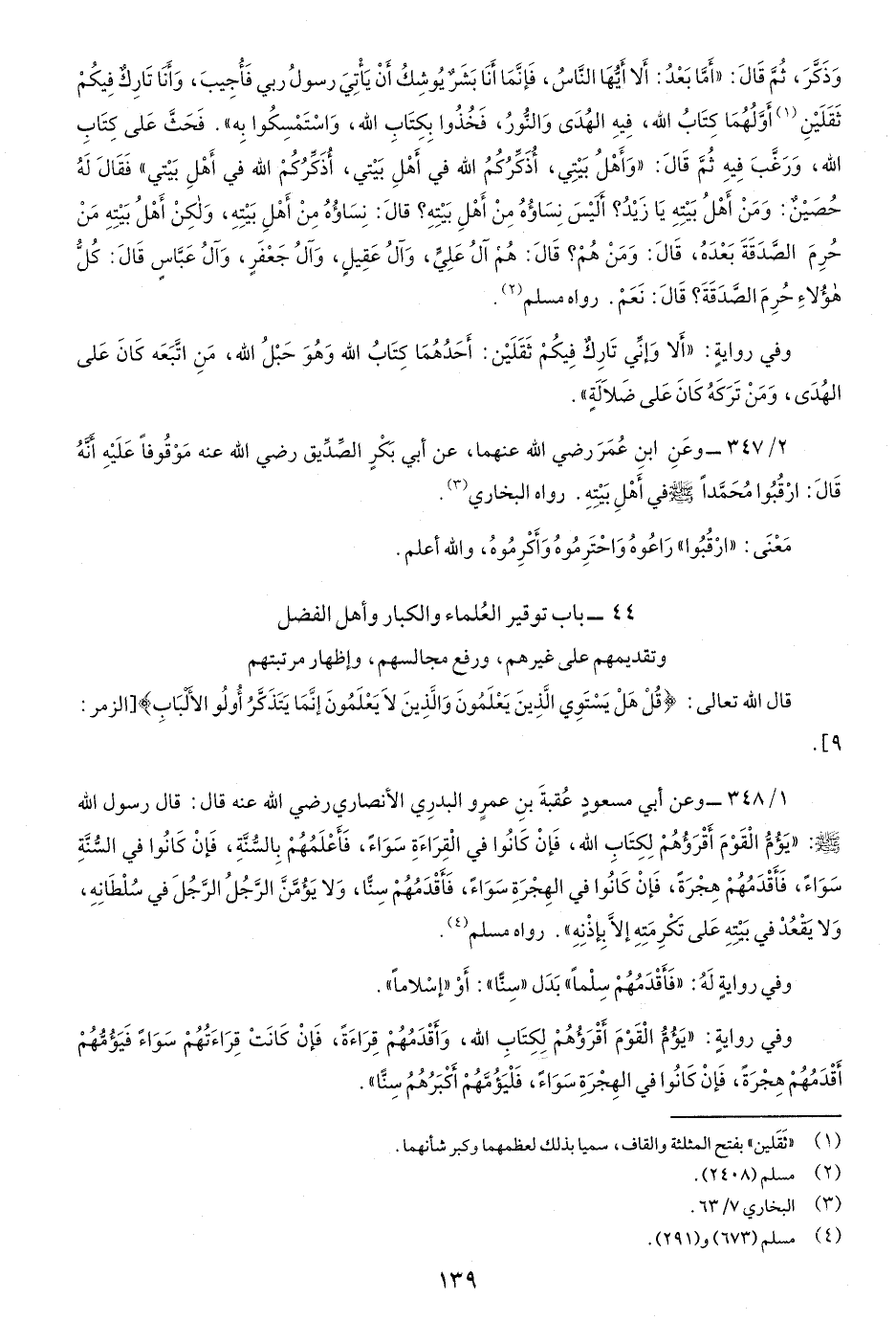 وَذَكَّرَ، ثُمَّ قَالَ: "أَمَّا بعْدُ: أَلا أَيُّهَا النَّاسُ، فَإِنَّمَا أَنَا بَشَرٌ يُوشِكُ أَنْ يَأْتِيَ رسولُ ربِّي فَأُجيبَ، وأَنَا تَارِكٌ فِيكُمْ ثَقَلَيْنِ: أَوَّلهُما كِتابُ اللَّهِ، فِيهِ الهُدى وَالنُّورُ، فَخُذُوا بِكِتابِ اللَّه، وَاسْتَمْسِكُوا بِهِ"فَحثَّ عَلَى كِتَابِ اللَّه، ورغَّبَ فِيهِ. ثمَّ قَالَ"وأَهْلُ بَيْتِي، أُذكِّركم اللَّه في أهلِ بيْتي، أذكِّرُكم اللَّه في أهل بيتي" فَقَالَ لَهُ حُصَيْنٌ: ومَنْ أَهْلِ بَيْتِهِ يَا زيْدُ؟ أَلَيْسَ نساؤُه مِنْ أهلِ بيتهِ؟ قَالَ: نساؤُه منْ أهلِ بيتِهِ وَلَكِن أَهْلُ بيْتِهِ منْ حُرِم الصَّدقَة بعْدَهُ، قَال: ومَنْ هُم؟ قَالَ: هُمْ آلُ عليٍّ، وآلُ عَقِيلٍ، وآلُ جَعْفَر، وَآلُ عبَّاسٍ، قَالَ: كُلُّ هُؤلاءِ حُرِمَ الصَّدقَةَ؟ قَالَ: نعَمْ. رواه مسلم.