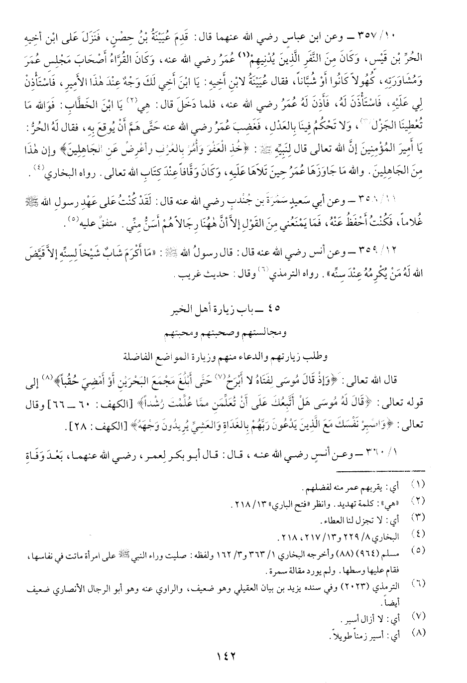 10/357-وعن ابن عباسٍ رضي اللَّه عنهما قال: قَدِمَ عُيَيْنَةُ بْنُ حِصْنٍ، فَنَزَلَ عَلَى ابنِ أَخِيهِ الحُرِّ بْنِ قَيْسٍ، وَكَانَ مِنَ النَّفَرِ الَّذِينَ يُدْنيهِمْ عُمَرُ رضي اللَّه عنه، وَكَانَ القُرَّاءُ أَصْحَابَ مَجْلِسِ عُمَرَ وَمُشَاوَرَتِهِ، كُهُولاً كَانُوا أَوْ شُبَّاناً، فَقَالَ عُيَيْنَةُ لابْنَ أَخِيهِ: يَا ابْنَ أَخي لَكَ وجْهٌ عِنْدَ هذَا الأَمِيرِ، فَاسْتَأْذِنْ لِي عَلَيْهِ، فَاسْتَأَذَنَ لَهُ، فَأَذِنَ لَهُ عُمَرُ رضي اللَّه عنه، فَلَمَّا دَخَل: قَالَ هِي يَا ابْنَ الخَطَّابِ: فَوَاللَّه مَا تُعْطِينَا الجَزْلَ، وَلا تَحْكُمُ فِينا بِالعَدْلِ، فَغَضِبَ عُمَرُ رضي اللَّه عنه حَتَّى هَمَّ أَنْ يُوقِعَ بِهِ، فَقَالَ لَهُ الحُرُّ: يَا أَمِيرَ المُؤْمِنِينَ إِنَّ اللَّه تَعَالَى قَالَ لِنَبِيِّهِ صَلّى اللهُ عَلَيْهِ وسَلَّم: {خُذِ العَفْوَ وَأْمُرْ بِالعُرْفِ وَأَعْرِضْ عَنِ الجَاهِلينَ} وَإنَّ هَذَا مِنَ الجَاهِلِينَ. واللَّهِ مَا جاوزَهَا عُمرُ حِينَ تَلاهَا عَلَيْهِ، وَكَانَ وَقَّافاً عِنْدَ كِتَابِ اللَّه تَعَالَى. رواه البخاري.