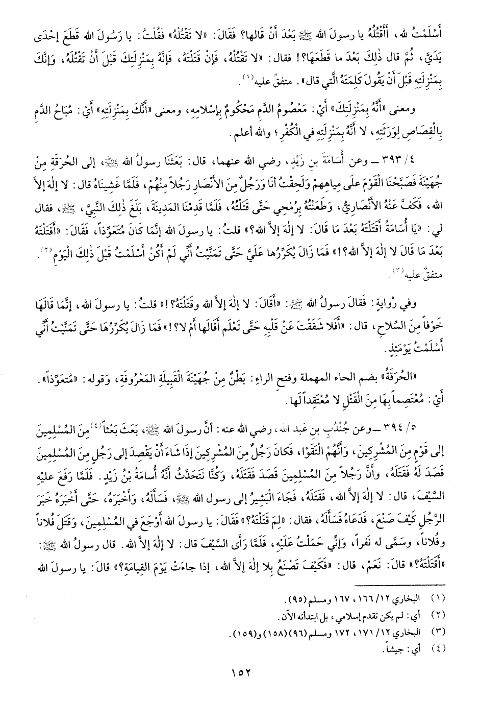 4/393-وعن أُسامةَ بنِ زَيْدٍ، رضي اللَّه عنهما، قَالَ: بعثَنَا رسولُ اللَّه صَلّى اللهُ عَلَيْهِ وسَلَّم إِلَى الحُرَقَةِ مِنْ جُهَيْنَةَ، فَصَبَّحْنا الْقَوْمَ عَلى مِياهِهمْ، وَلحِقْتُ أَنَا وَرَجُلٌ مِنَ الأَنْصَارِ رَجُلاً مِنهُمْ فَلَمَّا غَشِيناهُ قَالَ: لاَ إِلهِ إلاَّ اللَّه، فَكَفَّ عَنْهُ الأَنْصارِيُّ، وَطَعَنْتُهُ بِرْمِحِي حَتَّى قَتَلْتُهُ، فَلَمَّا قَدِمْنَا المَدينَةَ، بلَغَ ذلِكَ النَّبِيَّ صَلّى اللهُ عَلَيْهِ وسَلَّم، فَقَالَ لِي: "يَا أُسامةُ أَقَتَلْتَهُ بَعْدَ مَا قَالَ: لا إِلهَ إِلاَّ اللَّهُ؟ قلتُ: يَا رسولَ اللَّه إِنَّمَا كَانَ مُتَعَوِّذاً، فَقَالَ:"أَقًتَلْتَهُ بَعْدَ مَا قَالَ لا إِلهَ إِلاَّ اللَّهُ؟،" فَما زَالَ يُكَرِّرُهَا عَلَيَّ حَتَّى تَمنَّيْتُ أَنِّي لَمْ أَكُنْ أَسْلَمْتُ قَبْلَ ذلِكَ الْيَوْمِ. متفقٌ عَلَيهِ.