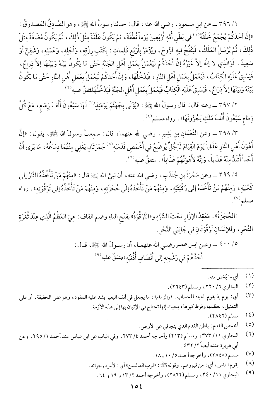 1/396- عن ابنِ مسعودٍ، رضي اللَّه عنه، قَالَ: حدثنا رسولُ اللَّه صَلّى اللهُ عَلَيْهِ وسَلَّم، وَهُوَ الصَّادِقُ المصدوقُ: "إِنَّ أَحَدَكُمْ يُجْمَعُ خَلْقُهُ في بَطْن أُمِّهِ أَرْبَعِينَ يَوْماً نُطْفَةً، ثُمَّ يَكُونُ عَلَقَةً مِثْلَ ذلِكَ، ثُمَّ يَكُونُ مُضْغَةً مثْلَ ذلِكَ، ثُمَّ يُرْسَلُ المَلَكُ، فَيَنْفُخُ فِيهِ الرَّوحَ، وَيُؤْمَرُ بِأَرْبَعِ كَلِماتٍ: بِكَتْبِ رِزقِةِ، وَأَجلِهِ، وَعمَلِهِ، وَشَقيٌّ أَوْ سعِيدٌ. فَوَ الَّذِي لا إِله غَيْرُهُ إِنَّ أَحَدَكُمْ لَيَعْمَلُ عَمَلَ أَهْلِ الجَنَّةِ حَتَّى مَا يَكُونُ بَيْنَهُ وبَيْنَهَا إِلاَّ ذِراعٌ، فَيَسْبقُ عَلَيْهِ الْكِتابُ، فَيَعْمَلُ بِعَمَلِ أَهْل النَّارِ، فَيَدْخُلُهَا، وَإِنَّ أَحَدَكُمْ لَيَعْمَلُ بِعَمَلِ أَهْلِ النَّارِ حَتَّى مَا يَكُونُ بَيْنَهُ وَبَيْنَهَا إِلاَّ ذِرَاعٌ، فَيَسْبِقُ عَلَيْهِ الْكِتَابُ فَيَعْمَلُ بِعَمَلِ أَهْلِ الجَنَّةِ فَيََدْخُلُهَا" متفقٌ عَلَيهِ.
