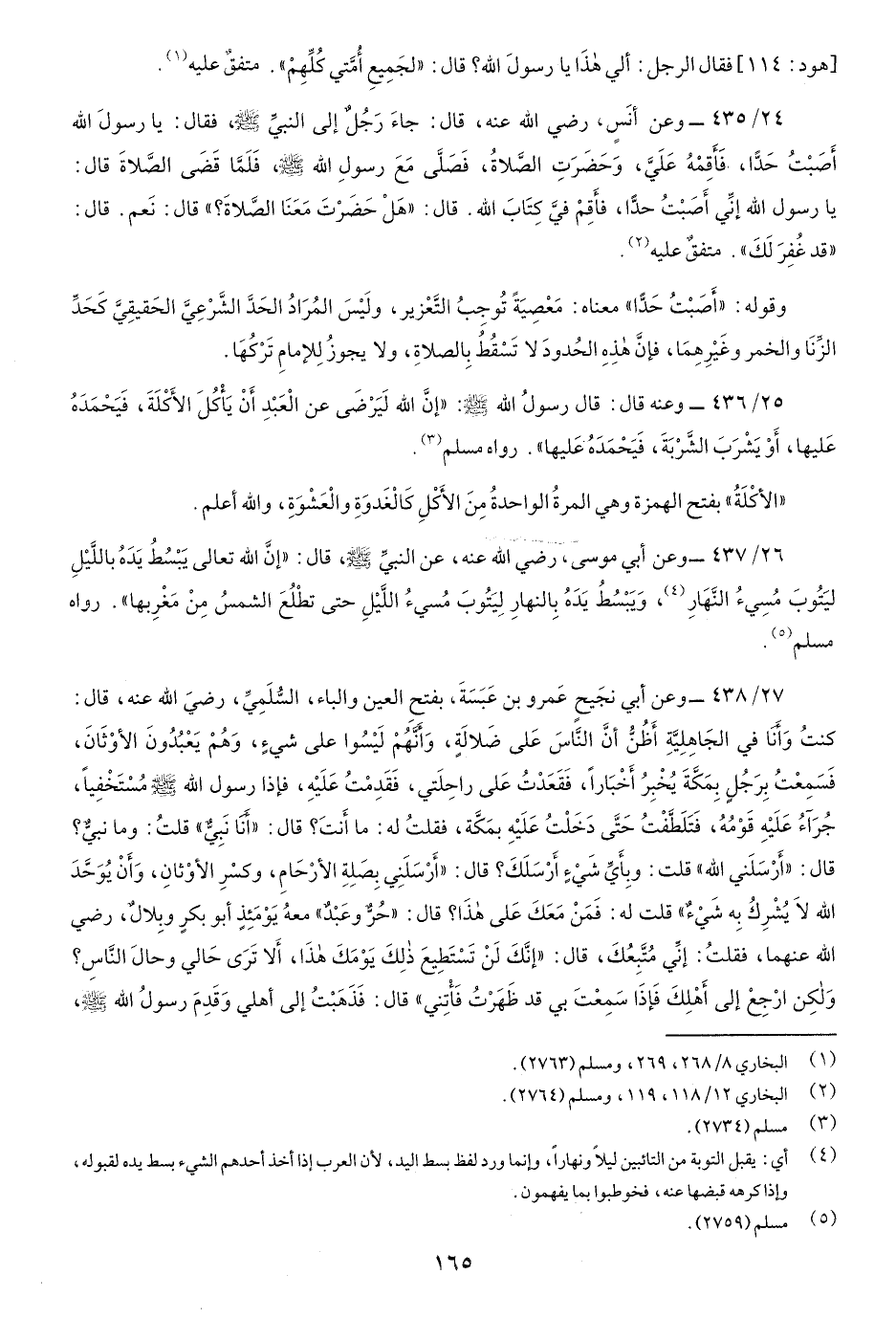 24/435-وعن أَنسٍ، رضي اللَّه عنه، قَالَ: جَاءَ رَجُلٌ إِلى النبيِّ صَلّى اللهُ عَلَيْهِ وسَلَّم فَقَالَ: يَا رسولَ اللَّهِ أَصَبْتُ حَدّاً، فَأَقِمْهُ عَلَيَّ، وَحَضَرتِ الصَّلاةُ فَصَلَّى مَعَ رَسُول اللَّه صَلّى اللهُ عَلَيْهِ وسَلَّم فَلَمَّا قَضَى الصَّلاة قَالَ: يَا رَسُول اللَّهِ إِنِّي أَصَبْتُ حَدّاً، فأَقِمْ فيَّ كتَابَ اللَّهِ، قَالَ: "هَلْ حَضَرْتَ مَعَنَا الصَّلاَةَ؟ "قَالَ: نَعم: قَالَ"قَدْ غُفِرَ لَكَ" متفقٌ عَلَيهِ.