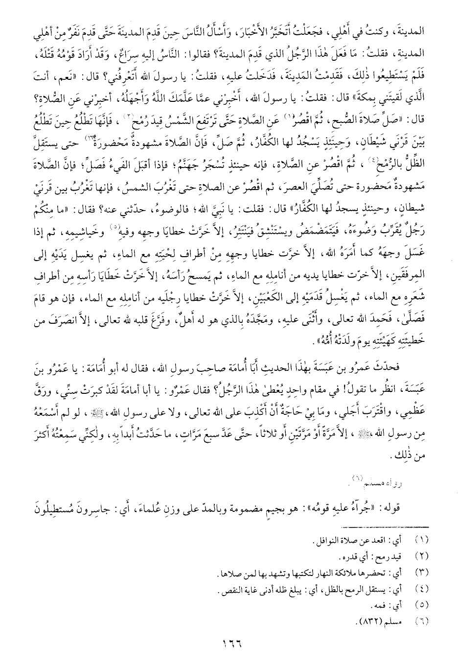 المَدينَةَ. وكنتُ في أَهْلي. فَجَعَلْتُ أَتَخَبَّرُ الأَخْبَارَ، وَأَسْأَلُ النَّاسَ حينَ قَدِمَ المَدِينَةَ حَتَّى قَدِمَ نَفرٌ مِنْ أَهْلي المدينةَ، فقلتُ: مَا فَعَلَ هَذَا الرَّجُلُ الَّذِي قدِم المدينةَ؟ فقالوا: النَّاسُ إِليهِ سِراعٌ وَقَدْ أَرَادَ قَوْمُه قَتْلَهُ، فَلَمْ يَستْطَيِعُوا ذلِكَ، فَقَدِمتُ المدينَةَ فَدَخَلتُ عليهِ، فقلتُ: يَا رسولَ اللَّه أَتَعرِفُني؟ قَالَ:"نَعم أَنتَ الَّذي لَقيتنَي بمكةَ"قَالَ: فقلتُ: يَا رَسُول اللَّه أَخْبرني عمَّا عَلَّمكَ اللَّه وَأَجْهَلُهُ، أَخبِرنْي عَنِ الصَّلاَةِ؟ قَالَ:"صَلِّ صَلاَةَ الصُّبحِ، ثُمَّ اقْصُرْ عَنِ الصَّلاةِ حَتَّى تَرتفَعِ الشَّمْسُ قِيدَ رُمْحٍ، فَإِنَّهَا تَطْلُعُ حِينَ تَطلُعُ بَيْنَ قَرْنَي شَيْطَانٍ، وَحِينئِذٍ يَسْجُدُ لَهَا الكفَّارُ، ثُمَّ صَل، فَإِنَّ الصَّلاَةَ مَشْهُودَةٌ مَحْضُورةٌ. حَتَّى يستقِلَّ الظِّلُّ بالرُّمحِ، ثُمَّ اقْصُر عَنِ الصَّلاةِ، فإِنه حينئذٍ تُسجَرُ جَهَنَّمُ، فإِذا أَقبلَ الفَيء فصَلِّ، فإِنَّ الصَّلاةَ مَشهودةٌ مَحضُورَةٌ حَتَّى تُصَلِّيَ العصرَ ثُمَّ اقْصُر عَنِ الصلاةِ حَتَّى تَغْرُبَ الشمسُ، فإِنها تُغرُبُ بَيْنَ قَرنيْ شيطانٍ، وحينئذٍ يَسْجُدُ لَهَا الكُفَّارُ".