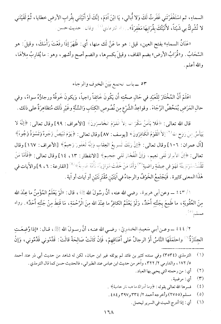 اعْلَمْ أنَّ المختار للعبد في حالة صِحَّتِهِ أنْ يَكُونَ خَائفاً رَاجِياً, وَيَكُونَ خَوْفُهُ وَرَجَاؤُهُ سَواءً, وفي حَالِ المَرَضِ يُمحَّضُ الرَّجاءُ. وقواعِدُ الشَّرْع مِنْ نصُوصِ الكِتَابِ والسُّنَةِ وغَيْرِ ذَلِكَ مُتظاهِرَةٌ عَلَى ذلك.