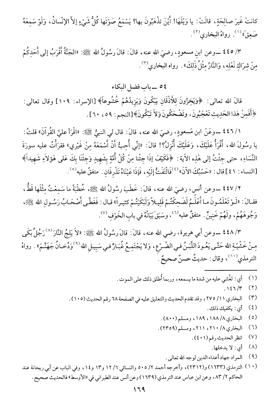 1/446-وعَن أبي مَسعودٍ، رضي اللَّه عنه. قالَ: قَالَ لي النبيُّ صَلّى اللهُ عَلَيْهِ وسَلَّم: "اقْرَأْ علَّي القُرآنَ"قلتُ: يَا رسُولَ اللَّه، أَقْرَأُ عَلَيْكَ، وَعَلَيْكَ أُنْزِلَ؟، قالَ:"إِني أُحِبُّ أَنْ أَسْمَعَهُ مِنْ غَيْرِي"فقرَأْتُ عَلَيْهِ سورَةَ النِّساء، حَتَّى جِئْتُ إِلى هذِهِ الآية: {فَكَيْفَ إِذا جِئْنا مِنْ كُلِّ أُمَّة بِشَهيد وِجئْنا بِكَ عَلى هَؤلاءِ شَهِيداً} [الآية: 41] قَالَ:"حَسْبُكَ الآنَ"فَالْتَفَتَّ إِليْهِ. فَإِذَا عِيْناهُ تَذْرِفانِ. متفقٌ عَلَيْهِ.
