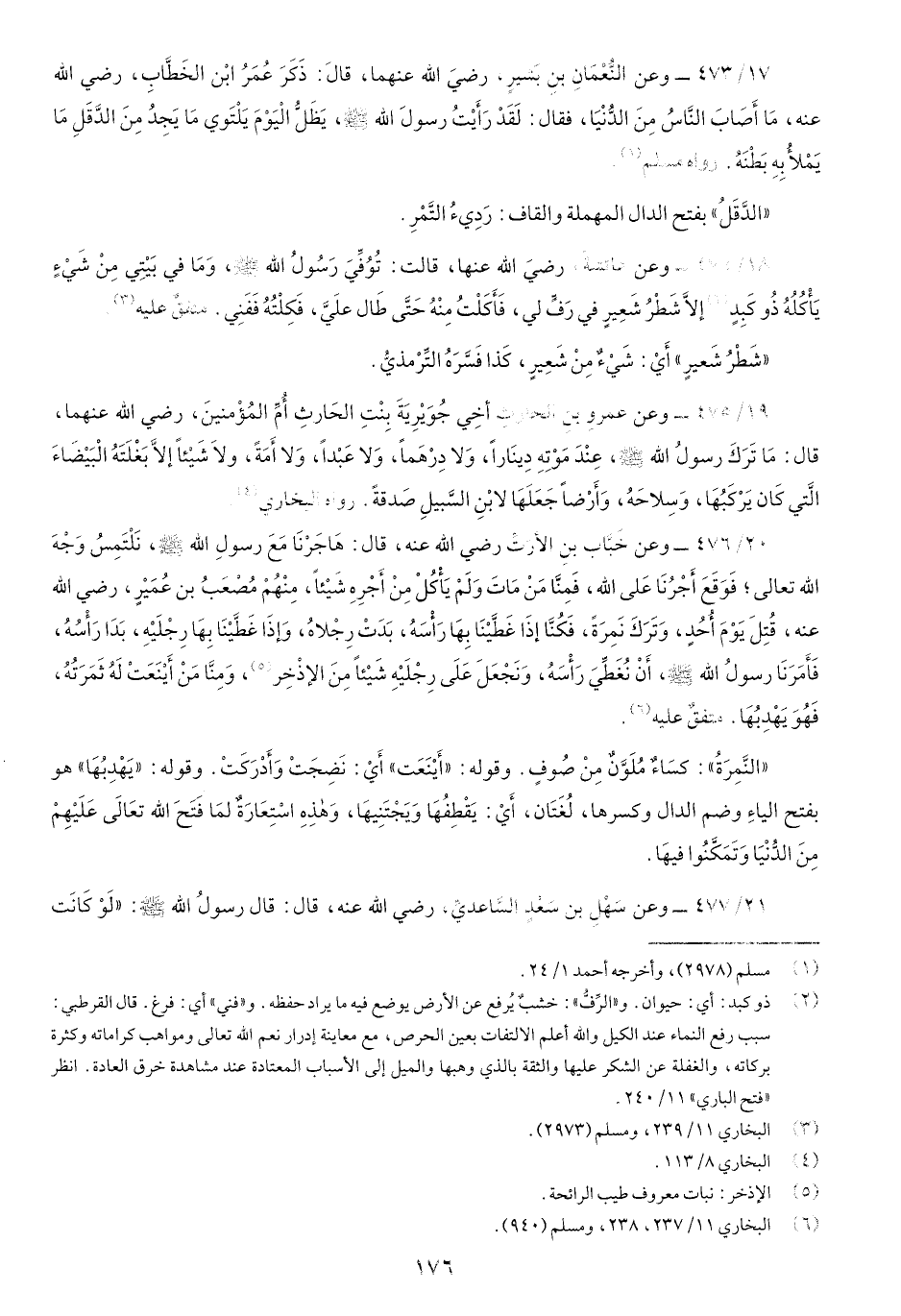 17/473-وعن النُّعْمَانِ بنِ بَشيرٍ، رضيَ اللَّه عنهما، قالَ: ذَكَر عُمَرُ بْنُ الخَطَّاب، رضي اللَّه عنه، مَا أَصَابَ النَّاسُ مِنَ الدُّنْيَا، فَقَالَ: لَقَدْ رَأَيْتُ رسول اللَّه صَلّى اللهُ عَلَيْهِ وسَلَّم يَظَلُّ الْيَوْمَ يَلْتَوي مَا يَجِدُ مِنَ الدَّقَل مَا يمْلأُ بِهِ بطْنَهُ. رواه مسلم.