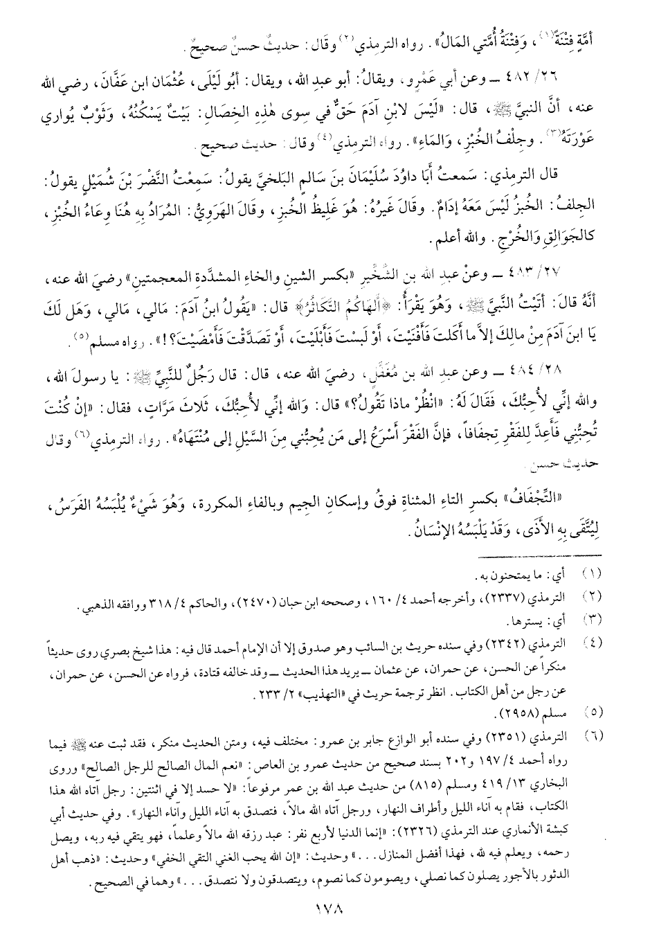 26/482-وعن أَبي عمرو، ويقالُ: أَبو عبدِ اللَّه، ويقالُ: أَبو لَيْلى عُثْمَانُ بنُ عَفَّانَ رضي اللَّه عنه، أَنَّ النبيَّ صَلّى اللهُ عَلَيْهِ وسَلَّم قَالَ: "لَيْسَ لابْن آدَمَ حَقٌّ في سِوى هَذِهِ الخِصَال: بَيْتٌ يَسْكُنُهُ، وَثَوْبٌ يُوَارِي عَوْرَتَهُ وَجِلْفُ الخُبز، وَالمَاءِ " رواه الترمذي وقال: حديث صحيح.