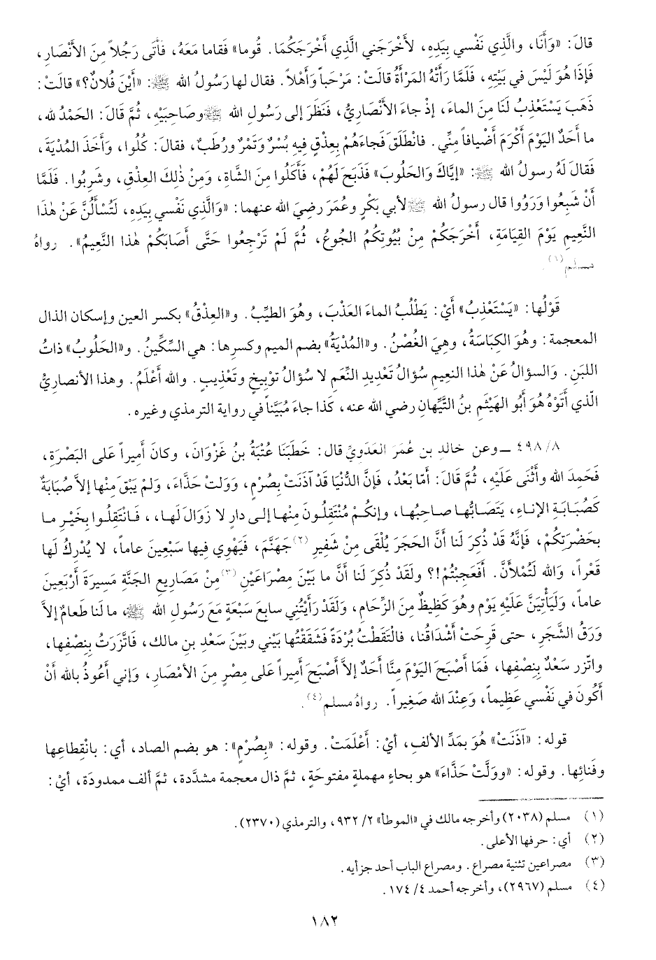 قالَ:"وَأََنا، والَّذِي نَفْسِي بِيَدِهِ، لأَخْرَجَني الَّذِي أَخْرَجَكُما. قُوما"فقَاما مَعَهُ، فَأَتَى رَجُلاً مِنَ الأَنْصارِ، فَإِذَا هُوَ لَيْسَ في بيتهِ، فَلَمَّا رَأَتْهُ المرَأَةُ قالَتْ: مَرْحَباً وَأَهْلاً. فقال لَهَا رَسُولُ اللَّه صَلّى اللهُ عَلَيْهِ وسَلَّم: "أَيْنَ فُلانٌ"قالَتْ: ذَهَبَ يَسْتَعْذِبُ لَنَا الماءَ، إِذْ جاءَ الأَنْصَاريُّ، فَنَظَرَ إِلَى رَسُولِ اللَّه صَلّى اللهُ عَلَيْهِ وسَلَّم وَصَاحِبَيْهِ، ثُمَّ قالَ: الحَمْدُ للَّه، مَا أَحَدٌ اليَوْمَ أَكْرَمَ أَضْيافاً مِنِّي فانْطَلقَ فَجَاءَهُمْ بِعِذْقٍ فِيهِ بُسْرٌ وتَمْرٌ ورُطَبٌ، فَقَالَ: كُلُوا، وَأَخَذَ المُدْيَةَ، فَقَالَ لَهُ رسُولُ اللَّه صَلّى اللهُ عَلَيْهِ وسَلَّم:"إِيَّاكَ وَالحَلُوبَ"فَذَبَحَ لَهُمْ، فَأَكلُوا مِنَ الشَّاةِ وَمِنْ ذلكَ العِذْقِ وشَرِبُوا. فلمَّا أَنْ شَبعُوا وَرَوُوا قَالَ رسولُ اللَّه صَلّى اللهُ عَلَيْهِ وسَلَّم لأَبي بكرٍ وعُمَرَ رضي اللَّه عنهما:"وَالَّذِي نَفْسي بِيَدِهِ، لَتُسْأَلُنَّ عَنْ هذَا النَّعيمِ يَوْمَ القِيامَةِ، أَخْرَجَكُمْ مِنْ بُيُوتِكُمُ الجُوعُ، ثُمَّ لَمْ تَرْجِعُوا حَتَّى أَصَابَكُمْ هذا النَّعِيمُ" رواه مسلم.