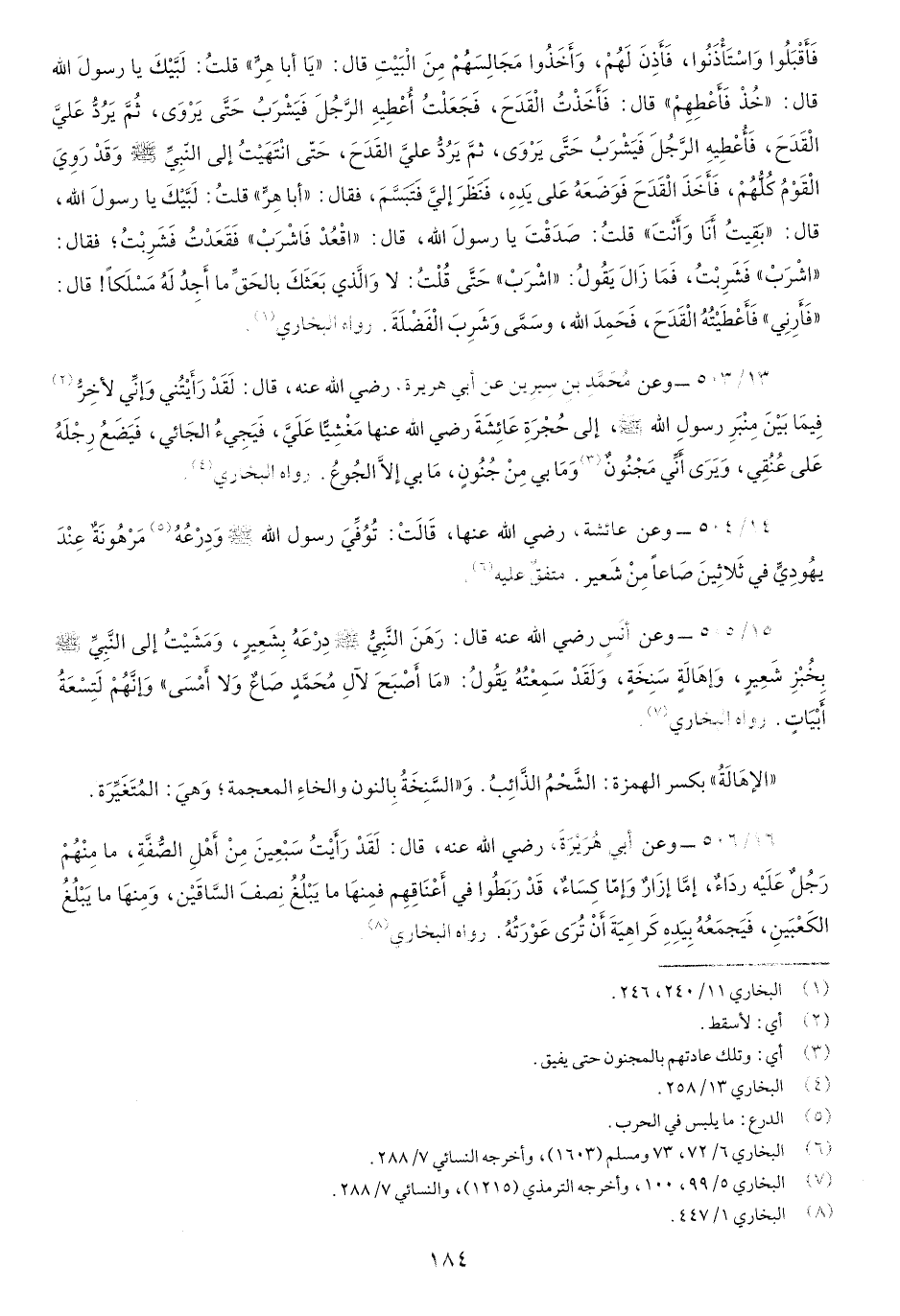 15/505-وعن أَنس رضي اللَّه عنه قَالَ: رَهَنَ النَّبِيُّ صَلّى اللهُ عَلَيْهِ وسَلَّم دِرْعهُ بِشَعِيرٍ، ومشيتُ إِلى النَّبِيِّ صَلّى اللهُ عَلَيْهِ وسَلَّم بِخُبْزِ شَعيرٍ، وَإِهَالَةٍ سَنِخَةٍ، وَلَقَدْ سمِعْتُهُ يقُولُ: " مَا أَصْبحَ لآلِ مُحَمَّدٍ صاعٌ وَلاَ أَمْسَى وَإِنَّهُم لَتِسْعَةُ أَبْيَاتٍ"رواه البخاري.