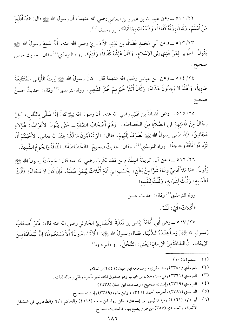 23/513-وعن أَبي مُحَمَّد فَضَالَةَ بنِ عُبَيْد الأَنْصَارِيِّ رضي اللَّه عنه، أَنَّهُ سَمِعَ رسولُ اللَّه صَلّى اللهُ عَلَيْهِ وسَلَّم يَقُولُ: "طُوبَى لِمَنْ هُدِيَ إِلى الإِْسلام، وَكَانَ عَيْشهُ كَفَافاً، وَقَنِعَ" رواه الترمذي وقال: حديثٌ حسن صحيح.