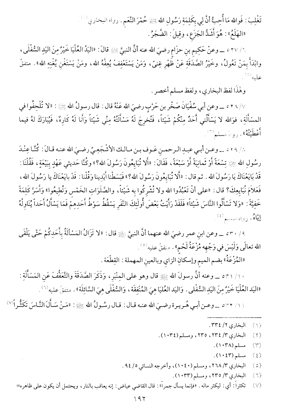 8/529-وعن أَبي عبدِ الرحمنِ عَوف بن مالِك الأَشْجَعِيِّ رضي اللَّه عنه قالَ: كُنَّا عِنْدَ رسُولِ اللَّه صَلّى اللهُ عَلَيْهِ وسَلَّم تِسَعْةً أَوْ ثَمَانِيَةً أَوْ سَبْعَةً، فَقَال: أَلاَ تُبَايِعُونَ رَسُولَ اللَّه صَلّى اللهُ عَلَيْهِ وسَلَّم وكُنَّا حَدِيثي عَهْدٍ بِبيْعَةٍ، فَقُلْنا: قَدْ بايعْناكَ يَا رسُولَ اللَّهِ، ثمَّ قالَ: "ألا تُبَايِعُونَ رسولَ اللهِ؟ "فَبَسَطْنا أيْدينا وقلنا قد بايعناك يا رسول الله فَعَلاَم نَبَايِعُكَ؟ قَالَ:"عَلَى أَنْ تَعْبُدُوا اللَّه وَلاَ تُشْرِكُوا بِهِ شَيْئاً، والصَّلَوَاتِ الخَمْس وَتِطيعُوا" وَأَسرَّ كلمَة خَفِيةً:" وَلاَ تَسْأَلُوا النَّاسِ شَيْئاً" فَلَقَدْ رَأَيتُ بَعْضَ أُولِئكَ النَّفَرِ يَسْقُطُ سَوْطُ أَحدِهِمْ فَما يَسْأَلُ أَحَداً يُنَاوِلُهُ إِيَّاهُ رواه مسلم.
